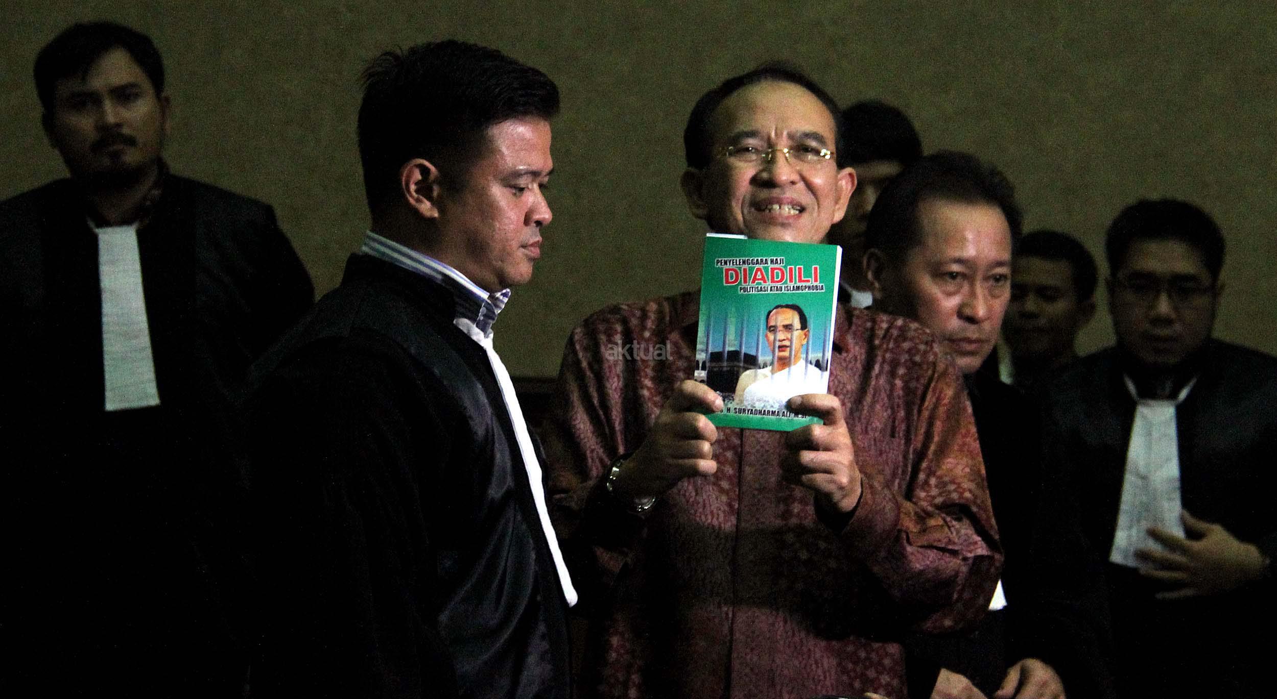 Mantan Menteri Agama Suryadharma Ali saat menunjukan bukunya usai menjalani sidang vonis di Pengadilan Tipikor, Jakarta , Senin (11/1/2016). Dalam putusan Majelis Hakim Pengadilan Tipikor memvonis Suryadharma Ali enam tahun penjara denda tiga ratus juta rupiah subsider tiga bulan dan pindana tambahan uang pengganti 1,821 miliar subsider dua tahun penjara.