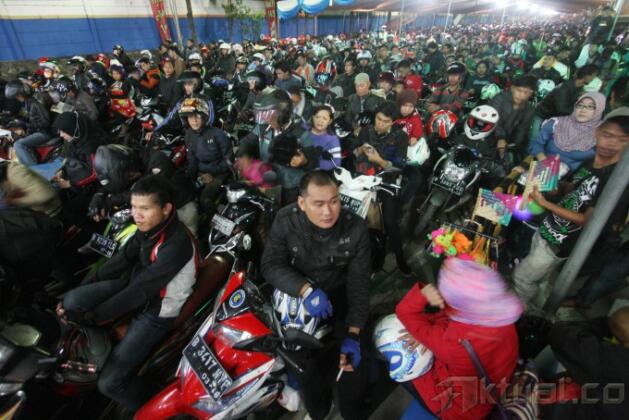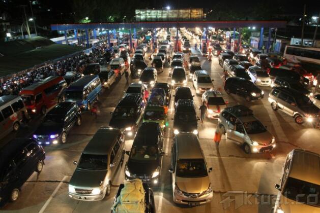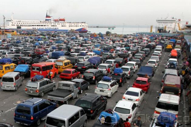 Ribuan kendaraan tengah antre untuk memasuki kapal feri di Pelabuhan Merak, Banten, Jumat (25/7/2014). Sejak tengah malam hingga pagi dini hari, kendaraan roda empat yang didominasi mobil pribadi ini terus membanjiri Pelabuhan Merak. Aktual/STR