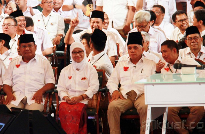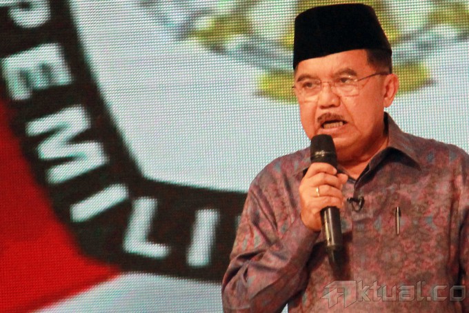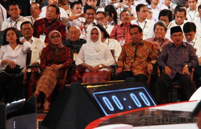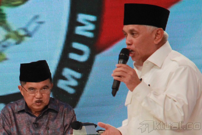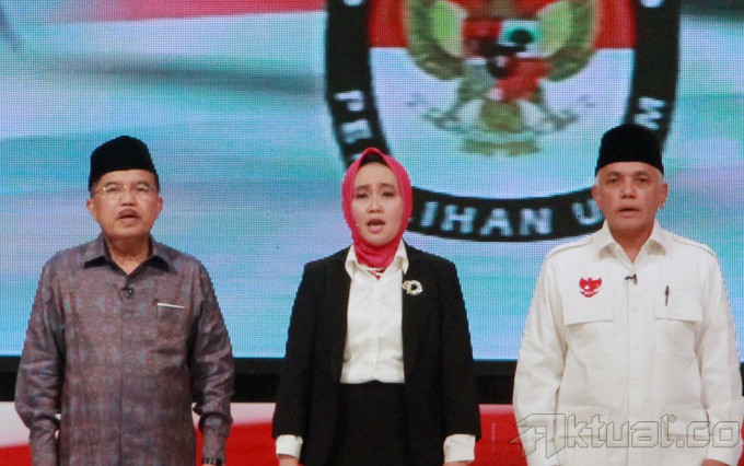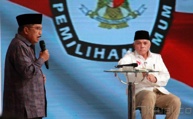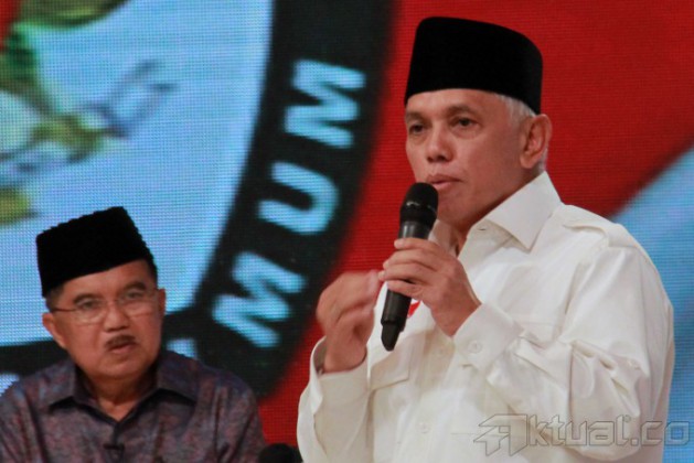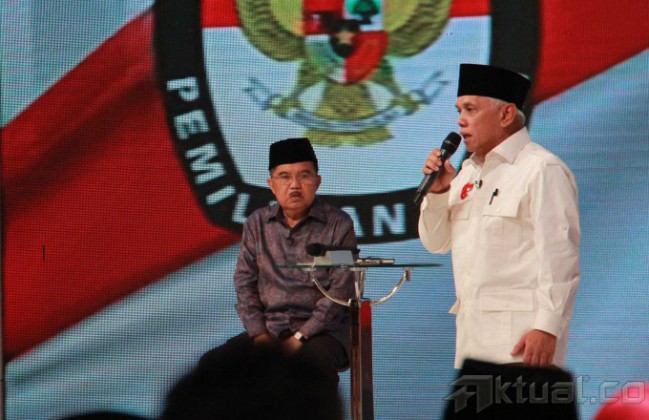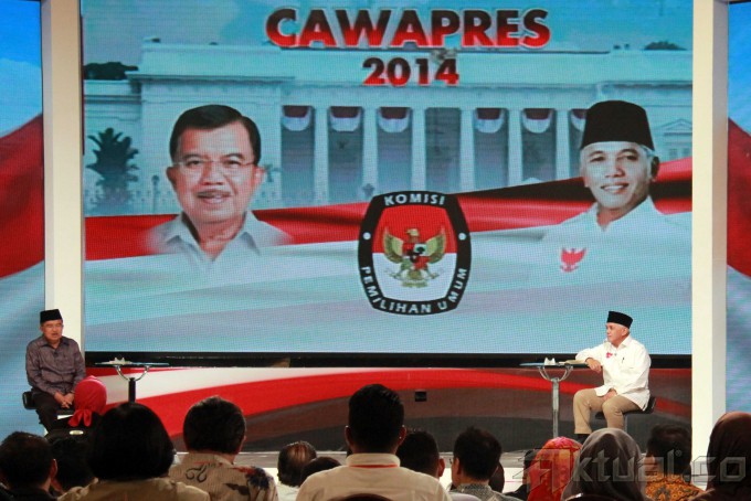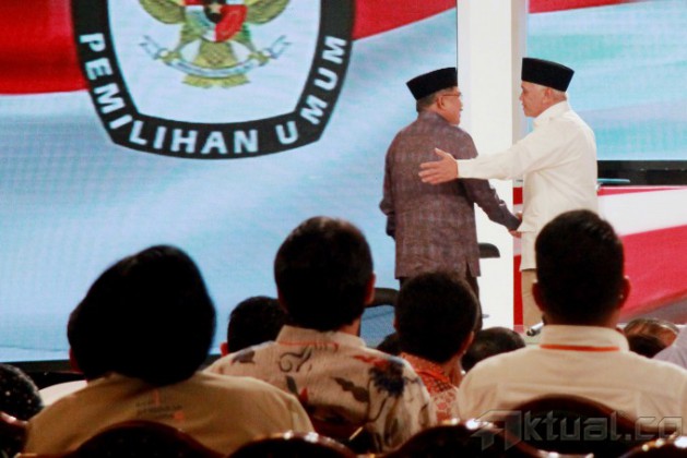 Cawapres no 1 Hatta Rajasa bersama Cawapres no 2 Jusuf Kalla saat debat cawapres di Jakarta, Minggu (29/6/2014). Debat yang di moderatori oleh Wakil Rektor Universitas Gadjah Mada Bidang Kerja Sama, Dwikorita Karnawati, mengambil tema ‘Pembangunan Sumber Daya Manusia (SDM) dan Ilmu Pengetahuan dan Teknologi (Iptek)`. Selain memaparkan visi misi, keduanya bakal adu gagasan dan argumentasi. Aktual/Tino Oktaviano