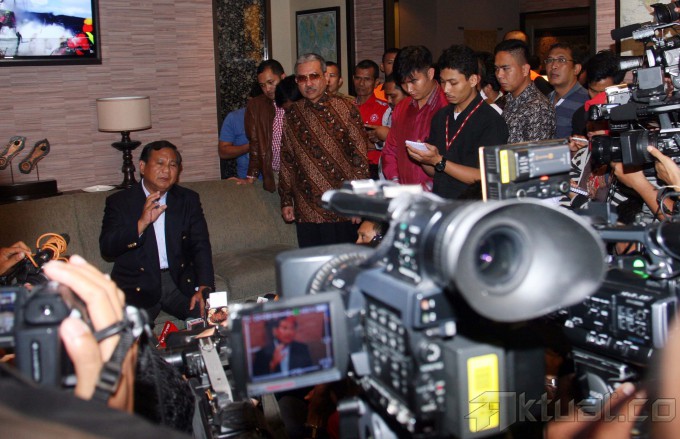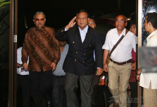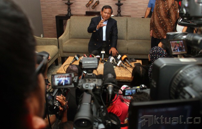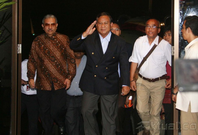 Calon Presiden dari partai Gerindra, Prabowo Subianto, menyampaikan seputar pembebasan Tenaga Kerja Wanita Wilfrida Soik di Bandara Halim Perdana Kusuma, Jakarta, Senin (7/4/2014) malam. Prabowo Subianto akhirnya sukses membebaskan anak bangsa yang terancam hukuman mati di Malaysia, Wilfrida. Sidang Pengadilan Kota Bahru, Kelantan, Malaysia akhirnya menyatakan Wilfrida tidak bersalah dan bebas. Aktual/Tino Oktaviano