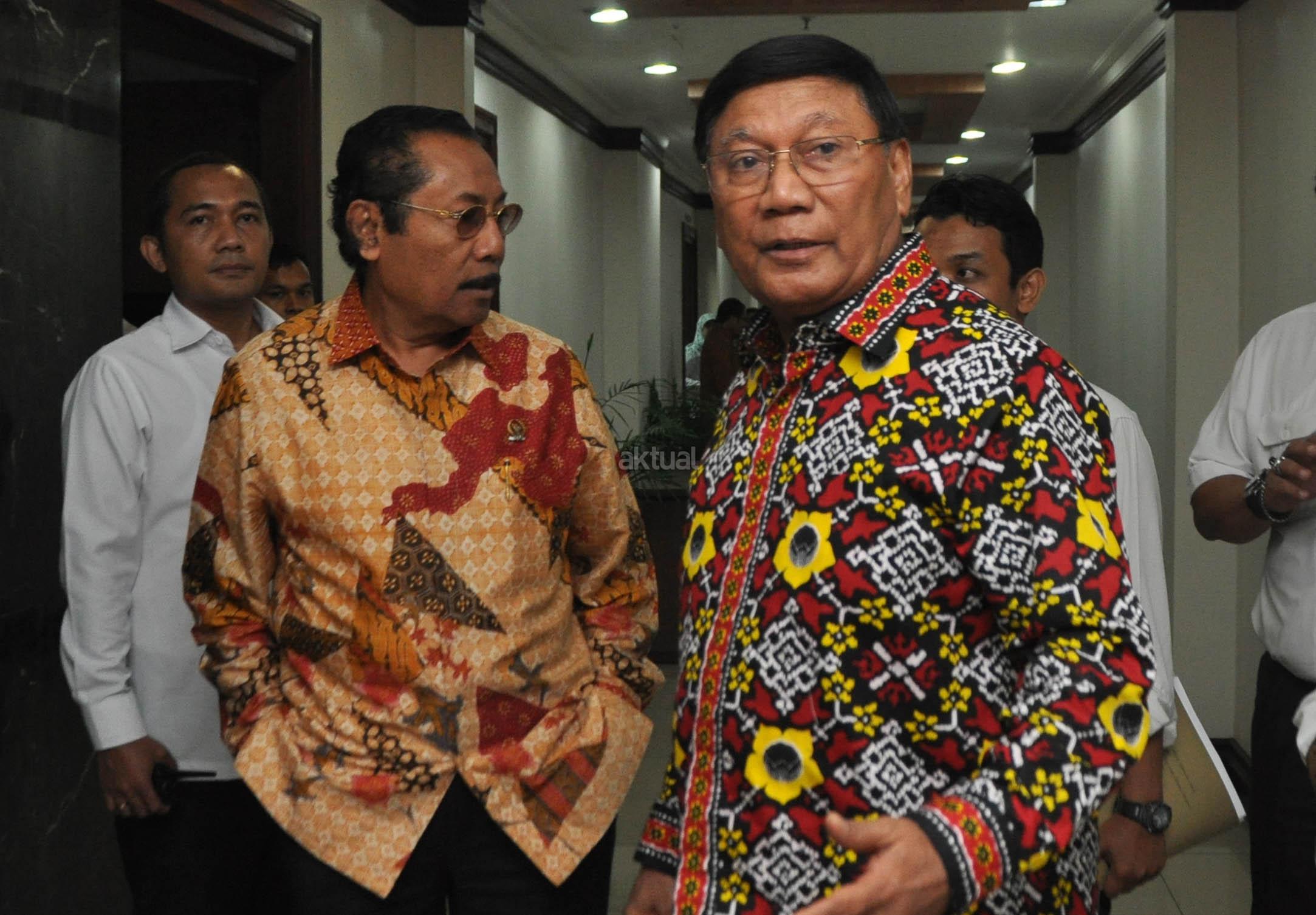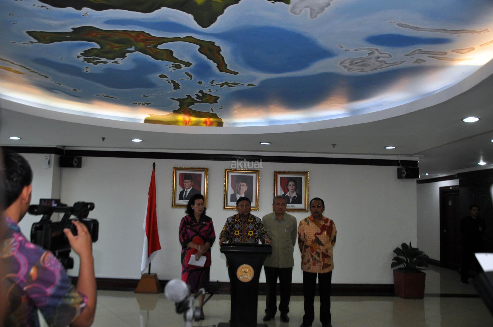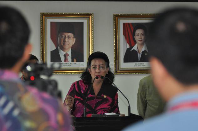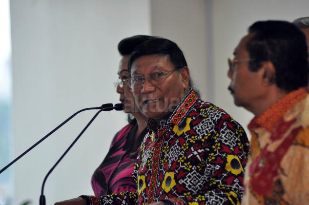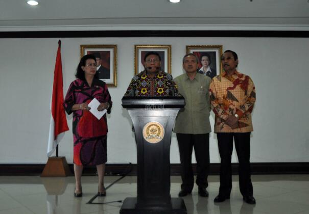 Wakil Ketua DPD, GKR Hemas bersama Wakil Ketua DPD, Farouk Muhammad dan Pimpinan BPKK DPD, Bambang Sadono dan John Pieris saat Konferensi Pers tentang GBHN di Kompleks Parlemen Senayan, Jakarta, Selasa (12/1/2016). DPD-RI Mendukung ide pengaktifan kembali Garis-Garis Besar Haluan Negara (GBHN) oleh Presiden Ke-5 Megawati Soekarno Putri dalam Rakernas PDIP karena sesuai dengan rekomendasi MPR RI 2009-2014.