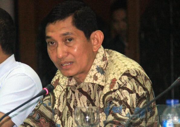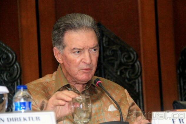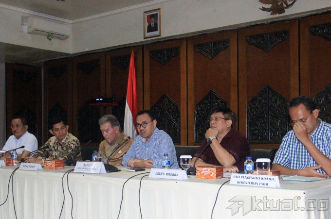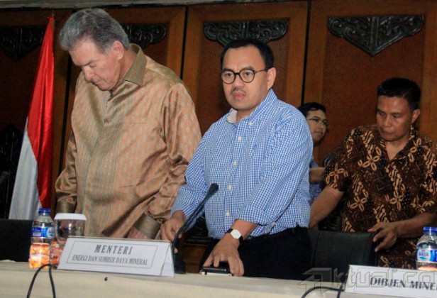 Menteri Energi dan Sumber Daya Mineral (ESDM) Sudirman Said (kanan) bersalaman dengan Chairman Freeport-McMoran James R. Moffet (tengah) disaksikkan Presiden Direktur PT Freeport Indonesia Maroef Sjamsoeddin (kiri) seusai memberi keterangan pers di Kementerian ESDM, Jakarta, Minggu (25/1/2015). Pemerintah dan Freeport sepakat memperpanjang pembahasan nota kesepahaman operasional selama 6 bulan. AKTUAL/MUNZIR