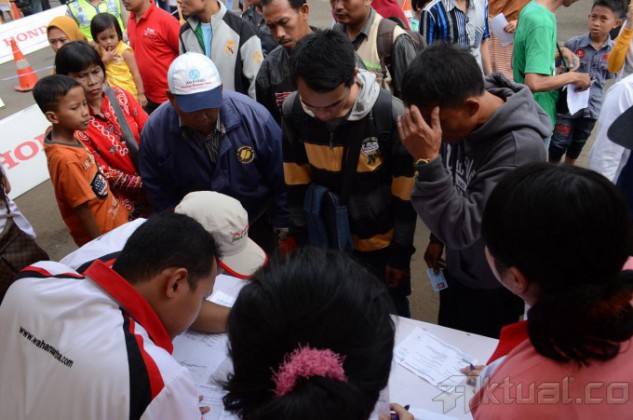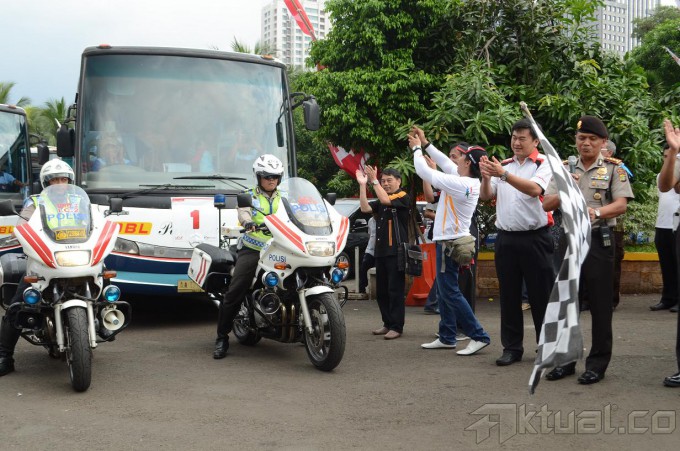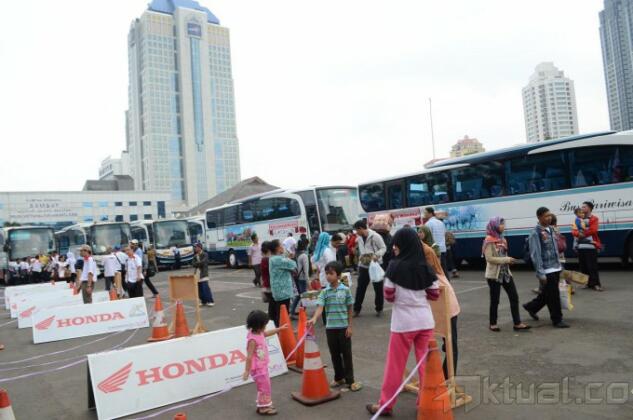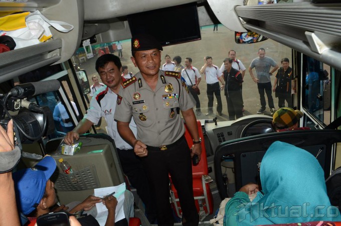 Chief of Marketing WMS, Edi Setiawan dan Direktur Sabhara Polda Metro Jaya, Kombes Marolop Manik. SH menyapa pemudik di Polda Metro Jaya, Kamis (24/07). Mudik gratis Bareng Wahana 2014 ini digelar oleh Main Dealer sepeda motor Honda Jakarta Tangerang PT. Wahana Makmur Sejati (WMS) diikuti oleh 1.600 orang yang berasal dari karyawan mekanik Astra Honda Authorized Service Station (AHASS), keluarga ojek mitra polisi, dan masyarakat umum. Kegiatan yang telah diadakan ketujuh kali ini merupakan upaya yang dilakukan Yayasan WahanaArtha selaku pelaksana mudik bareng menekan angka kecelakaan mudik lebaran yang didominasi oleh sepeda motor. Aktual/Wahanaartha