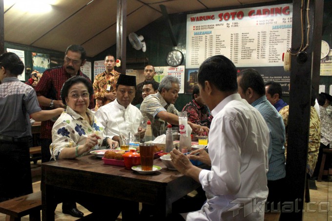 Presiden Joko Widodo ( kanan) menyantap soto bersama (kiri ke kanan) Ketua Umum PDI Perjuangan, Ketua Umum PPP hasil muktamar Surabaya M. Romahurmuziy, Gubernur Jateng Ganjar Pranowo, dan Sekjen Partai Nasdem Patrice Rio Capella di Soto Gading, Solo, Jateng, Sabtu (14/2). Sejumlah petinggi Koalisi Indonesia Hebat bertemu di Solo seusai menghadiri Munas ke-2 Partai Hanura yang dibuka di Solo Jumat (13/2). ANTARA FOTO/HO/Andika Betha