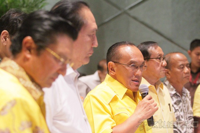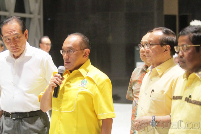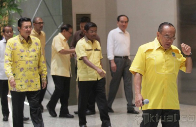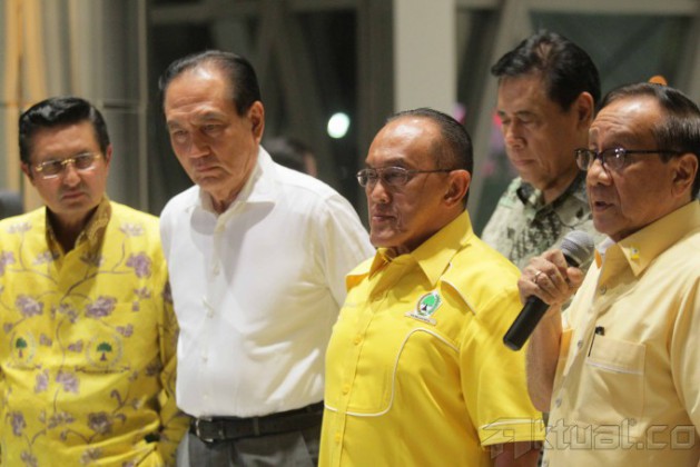 Ketua Umum Partai Golkar Aburizal Bakrie alias Ical didampingi pimpinan partai Golkar lainnya menggelar jumpa pers di Jakarta, Selasa (25/11/2014). Ical mengecam pembentukan presidium penyelamat partai yang dibuat para calon ketua umum partai berlambang beringin itu tidak sah. AKTUAL/TINO OKTAVIANO