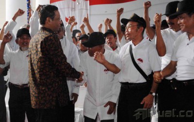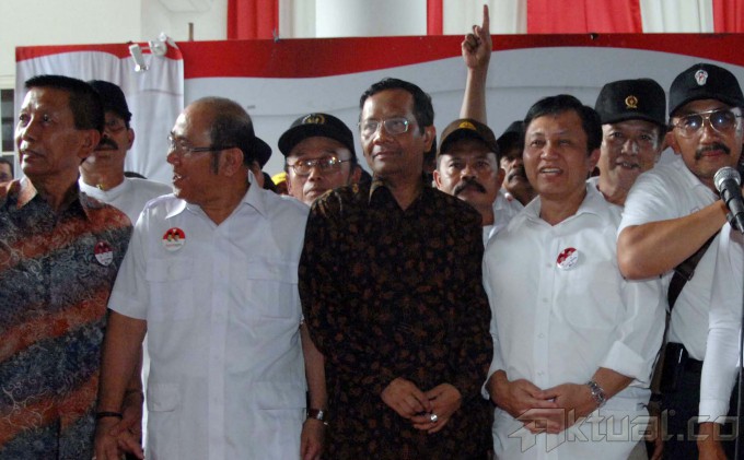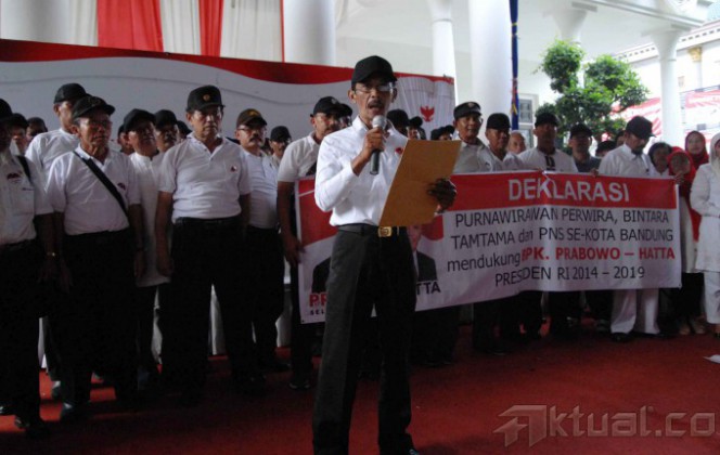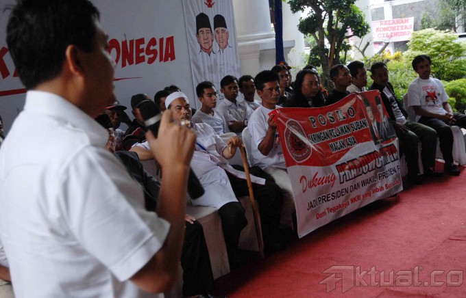 Sejumlah organisasi massa dan elemen masyarakat mendeklarasikan dukungan terhadap pasangan Prabowo – Hatta di Rumah Polonia, Cipinang, Jakarta Timur, Selasa (17/6/2014). Pendeklarasian dukungan dilakukan setiap hari dari pagi hingga malam hari. Berbagai ormas itu bakal bergantian berorasi menyatakan dukungan terhadap pasangan Prabowo – Hatta yang dihadiri sekitar ratusan pendukung. Aktual/Tino Oktaviano