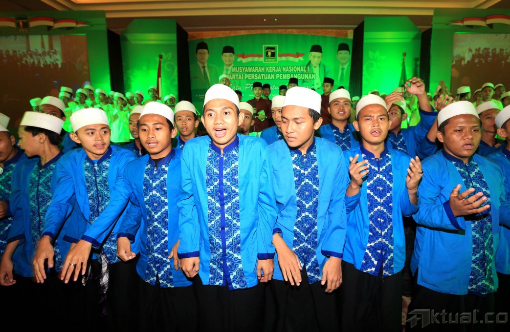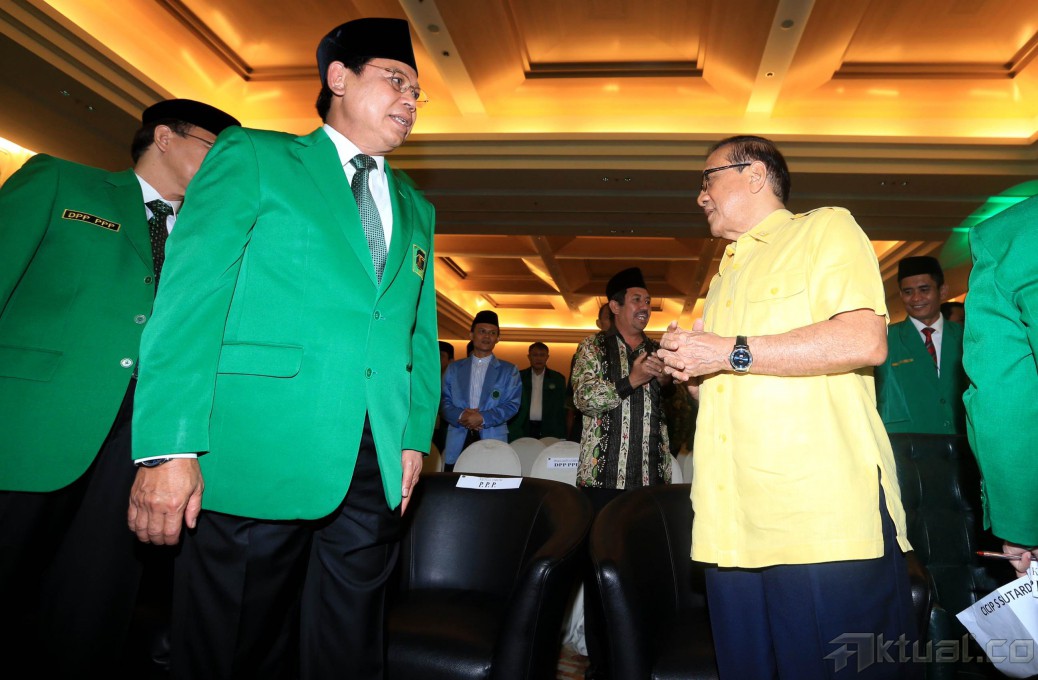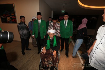 Ketua Majelis Pertimbangan Partai PPP, Surya Dharma Ali (kiri) bersama Ketua Umum Partai PPP, Djan Faridz (kanann), mendampingi Ketua Majelis Syariah KH Maimoen Zubair (Mbah Moen) saat menghadiri acara Musyawarah Kerja Nasional (Mukernas) I Partai Persatuan Pembangunan di Jakarta, Rabu (10/12/2014). Mukernas pertama PPP ini mengusung tema ‘Satu PPP untuk Indonesia’. AKTUAL/TINO OKTAVIANO