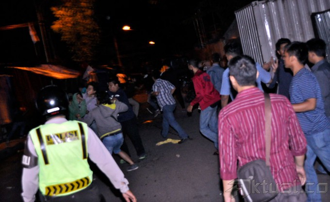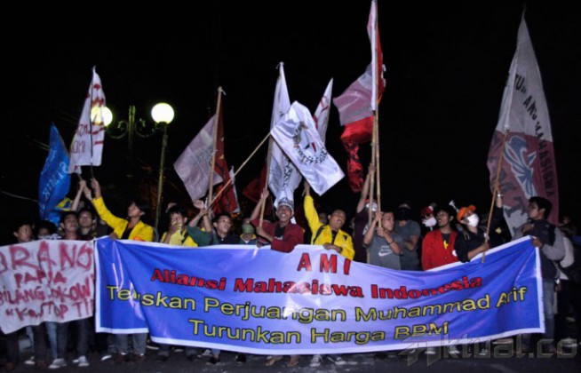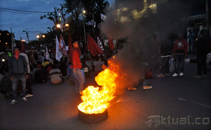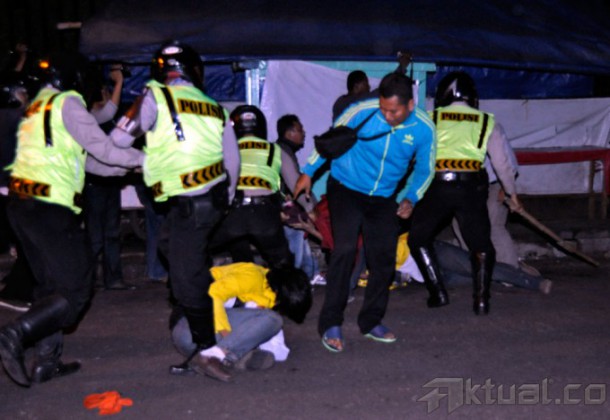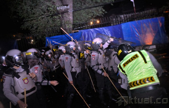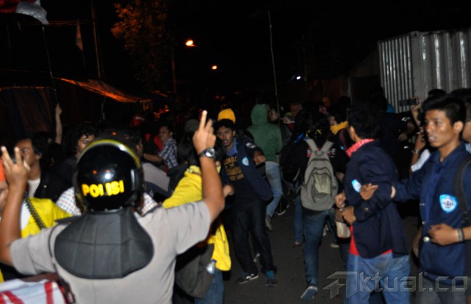 Aparat polisi menendang mahasiswa yang berunjuk rasa melawan Rezim Penindas Rakyat, Rezim Pembohong Rakyat !!, Antek Neolibarlisme dan Imperialisme di ruas Jalan Diponegoro, Jakarta Pusat, Rabu (3/12/2014) malam. Polisi membubarkan paksa mahasiswa yang tergabung dalam Semar UI, Formasi IISIP, Universitas Gunadarma, dan KBM UBK, dan Paramadina dengan menngunakan gas air mata. AKTUAL/MUNZIR
