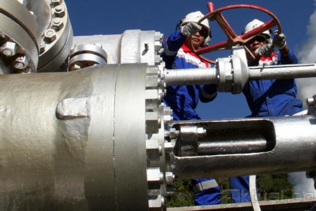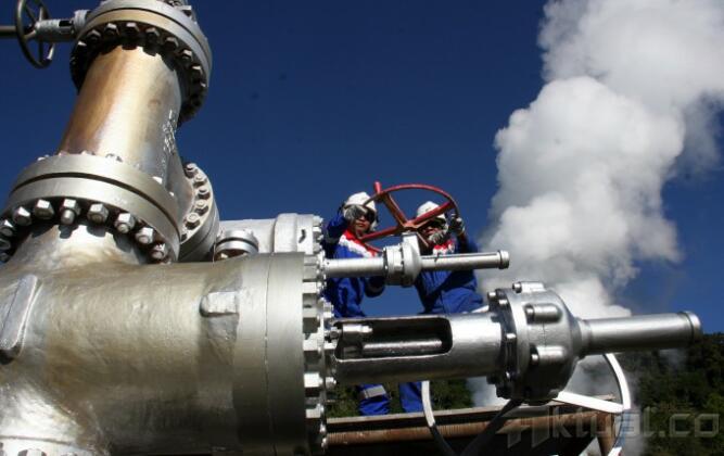 Dua pekerja PT Pertamina Geothermal Energy (PGE) tengah melakukan kegiatan uji produksi sumur KRH-4/1 yang merupakan salah satu sumur pengembangan proyek Pembangkit Listrik Tenaga Panas Bumi (PTLP) Karaha Unit 1 berkapasitas 1×30 MW di Proyek Karaha Bodas, Malangbong, Jawa Barat, Sabtu (19/4/2014). PLTP Karaha dijadwalkan mengalirkan listrik ke PLN akhir 2016. Aktual/Tino Oktaviano