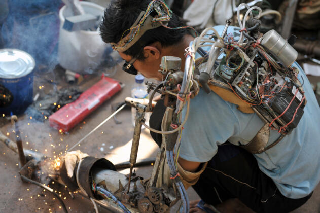 Seorang montir, I Wayan Sumardana alias Tawan memperbaiki alat sepeda motor pelanggan dengan lengan robot buatannya di bengkel kerjanya di Desa Nyuh Tebel, Karangasem, Bali, Kamis (21/1). Pria tamatan SMK tersebut merancang lengan robot dari barang bekas dengan pengendali elektronik dan mekanik untuk membantu gerak lengan kirinya yang mengalami kelumpuhan sejak enam bulan lalu. ANTARA FOTO/Nyoman Budhiana/nz/16.