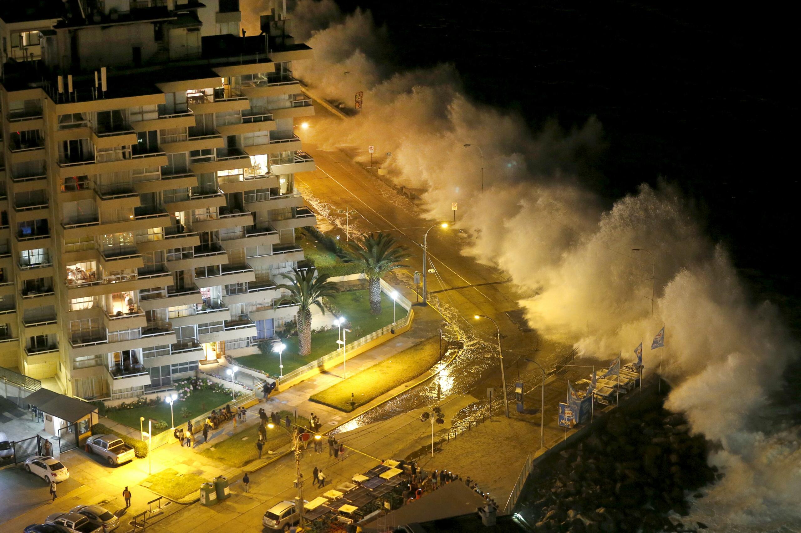 Wisatawan melihat gelombang tinggi di Samudra Pasifik di pesisir kota Vina del Mar, Cile, Senin (25/1). Ombak tinggi melanda pesisir Cile dari Afrika hingga Los Lagos, wisatawan telah diperingati oleh angkatan laut untuk menghindari pantai, terutama di malam dan pagi hari ketika gelombang pasang datang, menurut keterangan media setempat. ANTARA FOTO/REUTERS/Rodrigo Garrido/djo/16