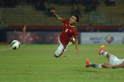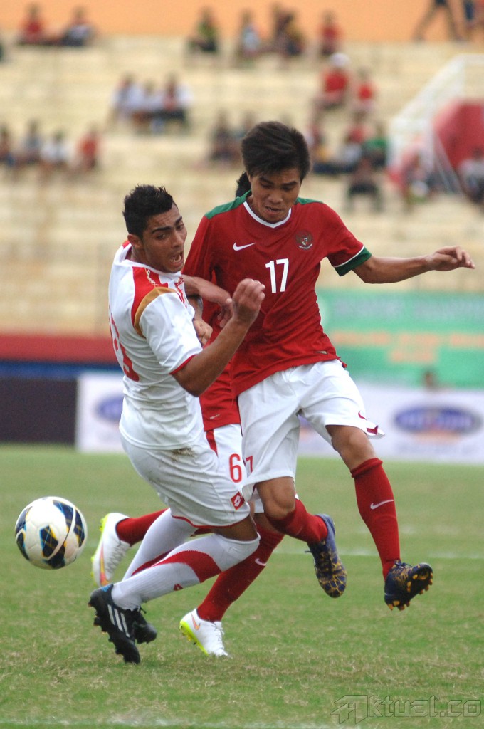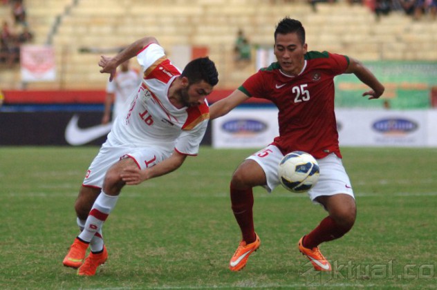 Pesepak bola Tim Nasional Indonesia U23, Yogi Rahadian (kiri) terpental usai diganjal oleh pesepak bola Tim Nasional Suriah U23, Wesam Diab (kanan) dalam pertandingan uji coba internasional di Gelora Delta Sidoarjo, Jatim, Sabtu (14/2). Timnas Indonesia U23 dilakahkan Timnas Suriah U23 dengan skor 0-3. ANTARA FOTO/M Risyal Hidayat