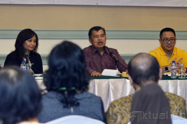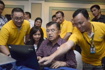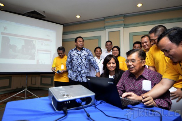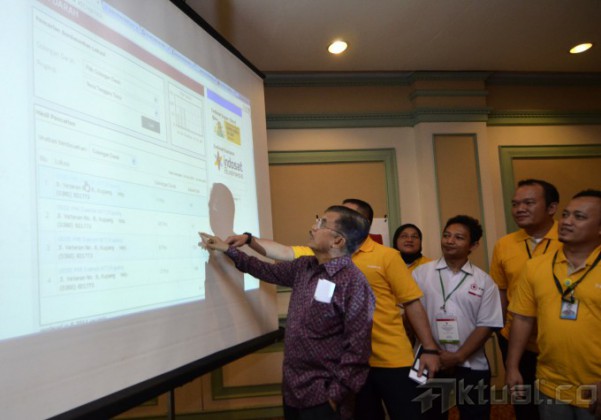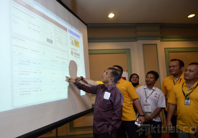 Ketua Palang Merah Indonesia (PMI) Jusuf Kalia (tengah) didampingi CEO PT Indosat Alexander Rusli (kanan) dan Managing Editor Leo Burnett, mengamati jumlah persediaan darah yang dapat diakses olah masyarakat di laman website milik PMI di Jakarta, Senin (16/12/2013). PMI bekerjasama dengan Indosat dan Leo Burnett Indonesia membuat aplikasi online “Ayo Donor” dan “Bloodbook” untuk meningkatkan pelayanan donor darah dalam menjaring pendonor darah sekaligus menjaga keberadaan donor darah guna memenuhi target kebutuhan nasional sebesar 4,8 juta kantong. Aktual/Roni Kuncoro