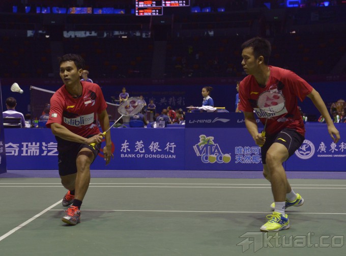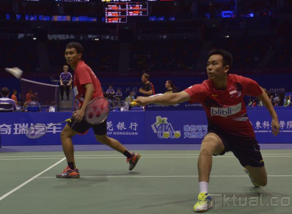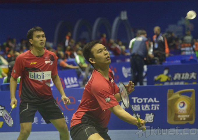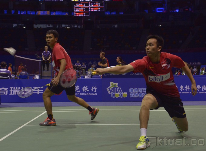 Pasangan ganda putra Indonesia Hendra Setiawan (kanan) dan Mohammad Ahsan (kiri) mengembalikan bola ke pasangan ganda putra Inggris Andrew Ellis dan Peter Mills pada penyisihan Piala Sudirman 2015 di Dongguan Basketball Center, Tiongkok, Senin (11/5). Tim Indonesia sementara unggul 2-0 atas tim bulu tangkis Inggris. ANTARA FOTO/Saptono