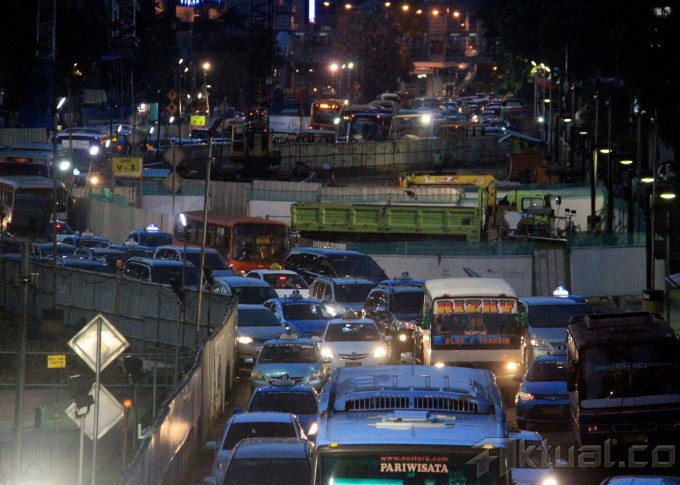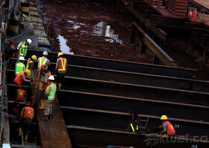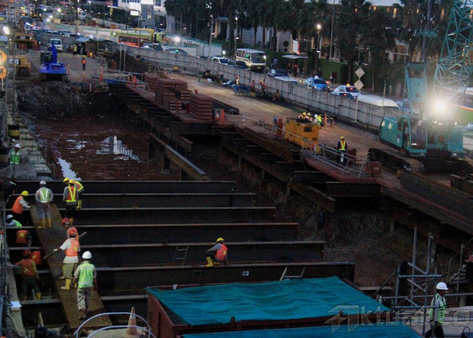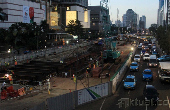 Pekerja mengerjakan pembangunan proyek Pembangunan Mass Rapid Transit (MRT) di Jalan Thamrin, Bunderan HI, Jakarta, Kamis (9/4/2015). Proyek MRT kini sudah memasuki tahap persiapan jelang pengeboran terowongan bawah tanah dan bulan Agusutus 2015 jalur bawah tanah MRT mulai dibor. AKTUAL/MUNZIR