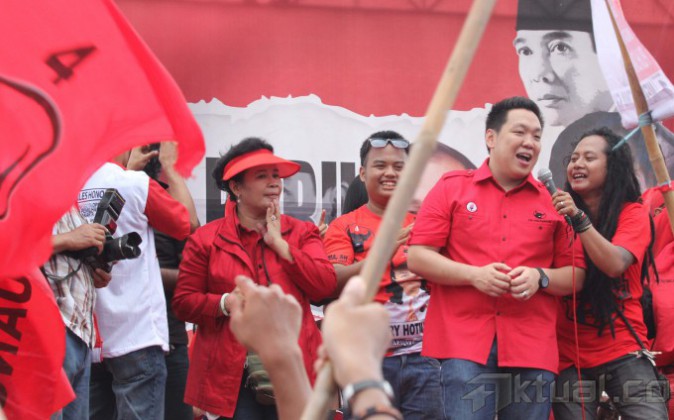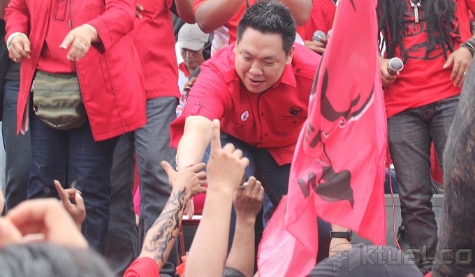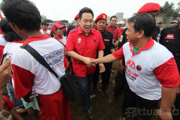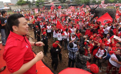 Caleg DPR RI PDI Perjuangan Dapil 3 DKI Jakarta Nomer Urut 7 Charles Honoris menggelar kampanye terbuka bersama penyanyi reggae untuk menghibur puluhan ribu simpatisan di Lapangan Kompas, Kembangan, Jakarta Barat, Minggu (23/3/14). Kampanye yang dihadiri sebagian pemilih muda mengajak agar tidak bersikap anti terhadap politik serta mau membuka wawasan menjelang Pemilu Legislatif 9 April serta Pemilu Presiden 9 Juli 2014. Aktual/Tino Oktaviano