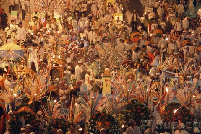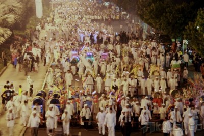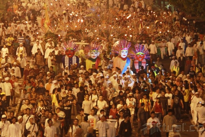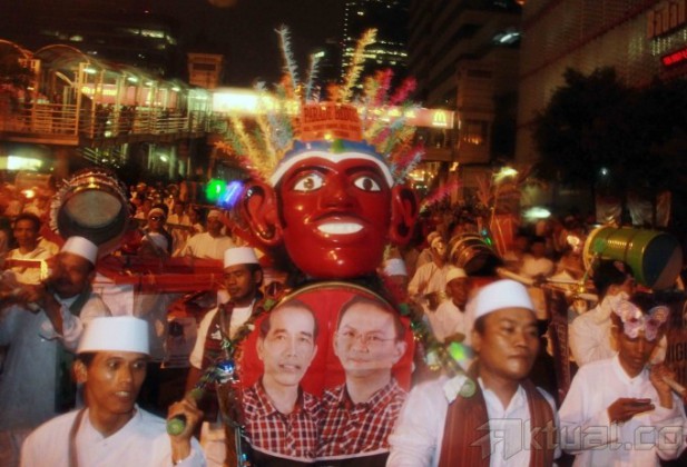 Ribuan umat muslim mengikuti pawai bertajuk “Jakarta Night Religious Festival” saat melintasi Protokol Thamrin Jakarta, Senin (14/10/2013). Pawai 1000 bedug dari Jalan MH Thamrin hingga Monas serta dimeriahkan 20 panggung hiburan tersebut untuk memeriahkan malam takbir menyambut Hari Raya Idul Adha. Aktual/Tino Oktaviano