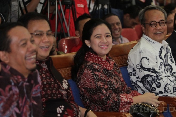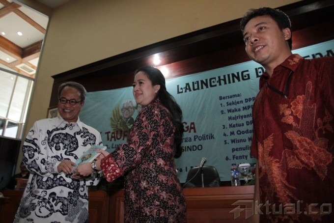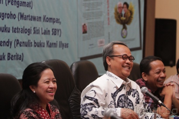 Wakil Ketua MPR Hajriyanto Y Thohari (kanan), Ketua Fraksi PDI Perjuangan DPR Puan Maharani (dua dari kanan), Sekretaris Fraksi PDI P di MPR Ahmad Basarah ((dua dari kiri), dan Pengamat Politik Ahmad Qodari (kiri) saat diskusi Bedah Buku “Pak Taufiq dan Bu Mega” di Gedung Parlemen Senayan, Jakarta, Rabu (4/9). Buku setebal 206 halaman karya Rahmat Sahid ini menceritakan sisi lain kehidupan pasangan Taufiq Kiemas dan Megawati Soekarnoputri yang tidak pernah terpublikasi, dituturkan secara ringan, unik dan lucu. Aktual/Tino Oktaviano