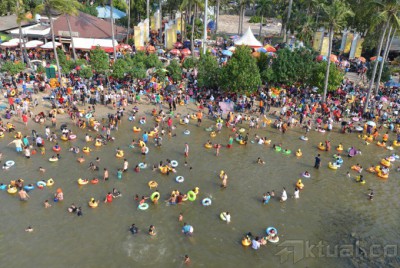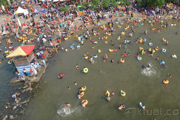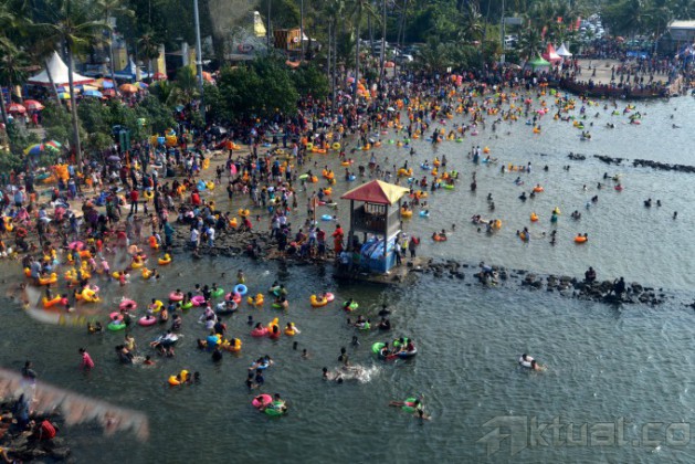 Pengunjung bermain air di kawasan Pantai Ancol, Jakarta Utara, Selasa (29/7/2014). Saat liburan Idul Fitri Pengunjung yang datang ke tempat tersebut diperkirakan sekitar 75.000 orang akan memadati Ancol setiap hari. Aktual/Tino Oktaviano