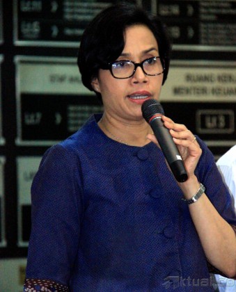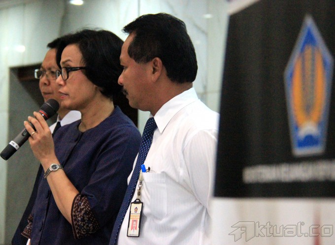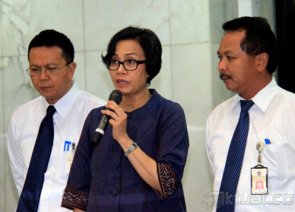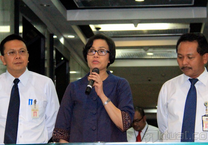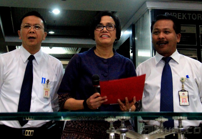 Mantan Menteri Keuangan Sri Mulyani Indrawati (tengah) didampingi Kepala Biro Bantuan Hukum Kementerian Keuangan Indra Surya (kanan) dan Kepala Bagian Bantuan Hukum I Didik Hariyanto (kiri), saat memberikan keterangan pers usai pemeriksaan oleh Bareskrim Mabes Polri di gedung Juanda, Kementrian Keuangan, Jakarta, Senin (8/6/2015) malam. Sri Mulyani diperiksa sebagai saksi kasus dugaan korupsi kondensat yang melibatkan SKK Migas dan PT Trans Pacific Petrochemical Indotama (TPPI). AKTUAL/MUNZIR
