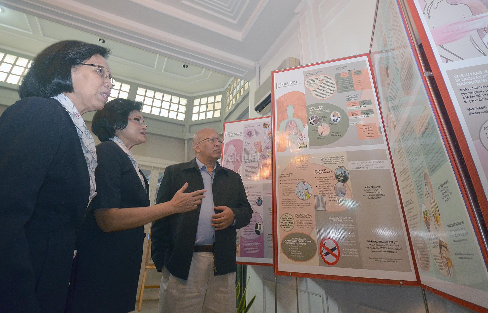 Ketua Umum Yayasan Kanker Indonesia (YKI) Sylvia Harry Purnomo (tengah) bersama Ketua Panitia World Cancer Day 2016 Lukiarti Rukmini (kiri) dan Anggota Pelayanan Sosial Aru W.Sudoyo, melihat display layanan setelah keterangan media tentang kegiatan YKI dalam menyambut Hari Kanker Sedunia 2016, di Jakarta, Rabu (3/2). Kegiatan yang dilaksanakan setiap tanggal 4 Februari dengan tema tahun ini “We can, I can” akan diisi dengan berbagai aksi antara lain pemeriksaan kesehatan gratis, gerak jalan dan donasi.Aktual.com/Eko S Hilman