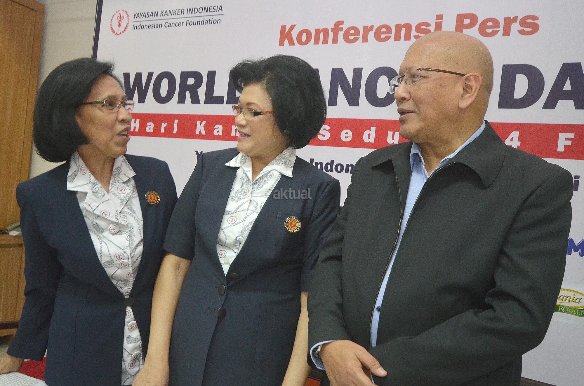 Ketua Umum Yayasan Kanker Indonesia (YKI) Sylvia Harry Purnomo (tengah) bersama Ketua Panitia World Cancer Day 2016 Lukiarti Rukmini (kiri) dan Anggota Pelayanan Sosial Aru W.Sudoyo, bersiap memberikan keterangan media tentang kegiatan YKI dalam menyambut Hari Kanker Sedunia 2016, di Jakarta, Rabu (3/2). Kegiatan yang dilaksanakan setiap tanggal 4 Februari dengan tema tahun ini “We can, I can” akan diisi dengan berbagai aksi antara lain pemeriksaan kesehatan gratis, gerak jalan dan donasi. Aktual.com/Eko S Hilman