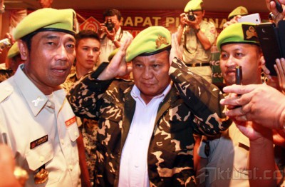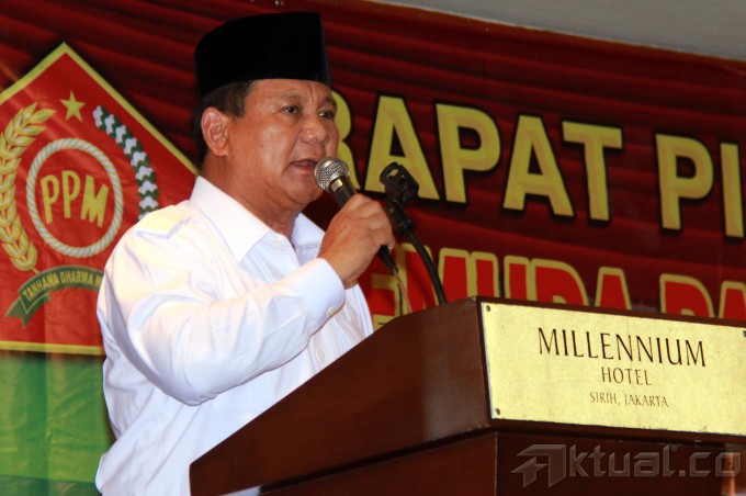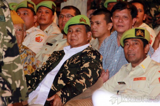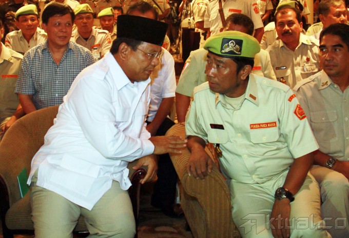 Capres Prabowo Subianto, mendapat dukungan dari Pemuda Panca Marga (PPM), sebuah organisasi kemasyarakatan yang dipimpin Abraham Lunggana atau lulung saat deklarasi di Jakarta, Jumat (30/5/2014). PPM mendeklarasikan dukungan kepada Prabowo-Hatta di Pilpres 9 Juli mendatang. Aktual/Tino Oktaviano