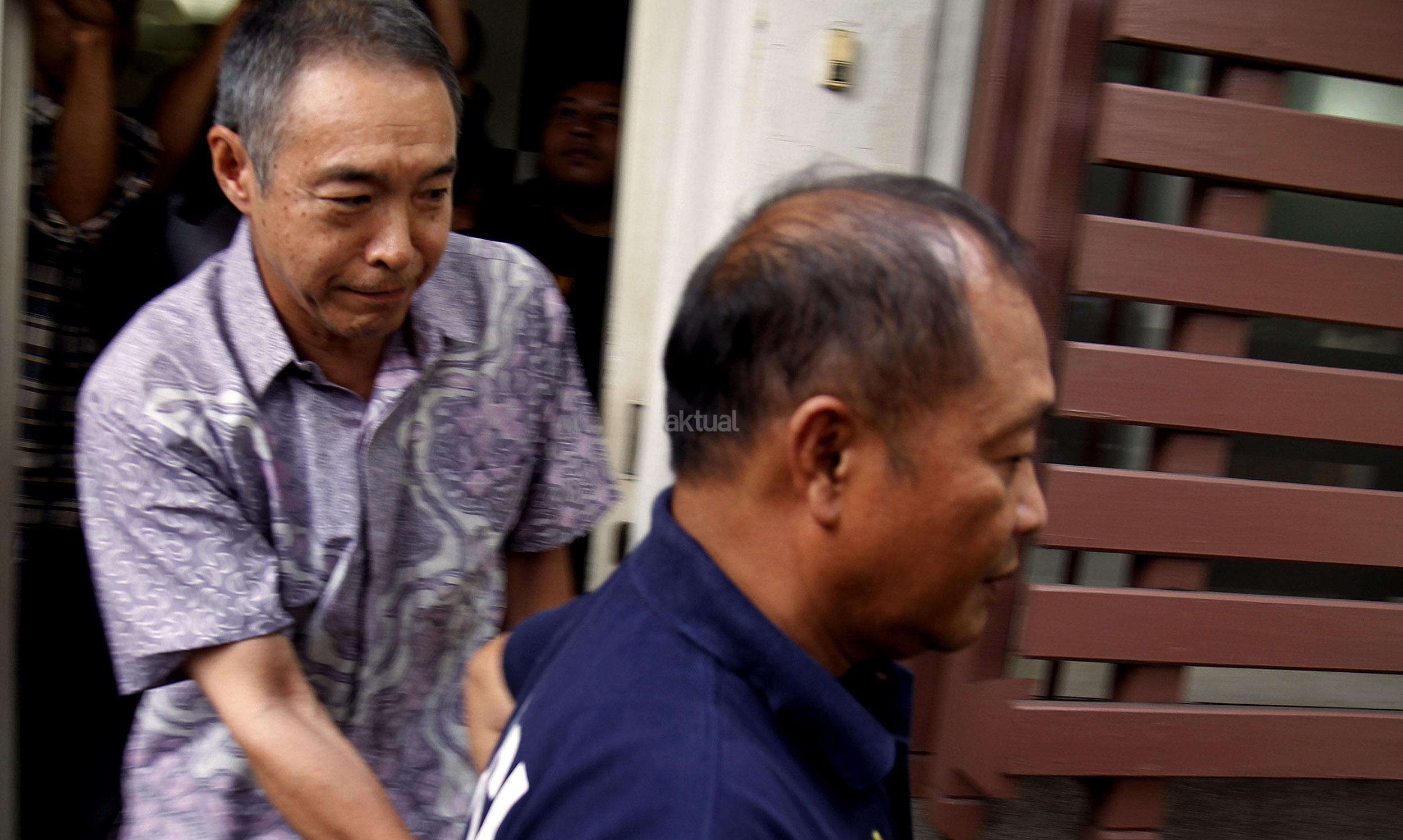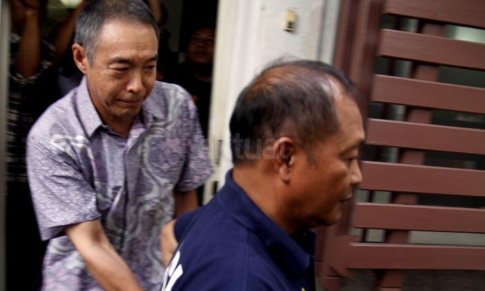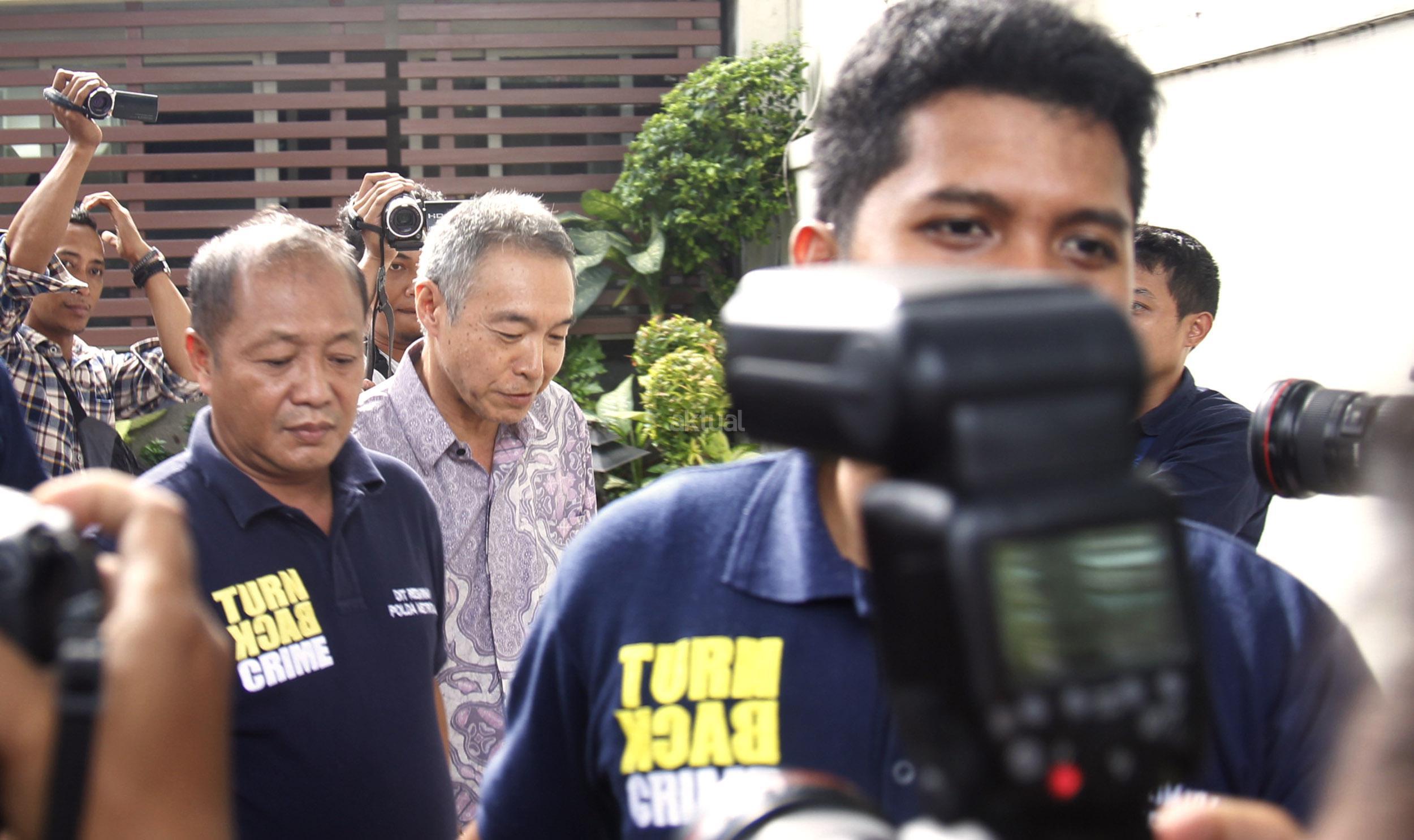 Warga negara Jepang Akira Tarumoto saat dibawa oleh pihak berwajib dari tempat praktiknya sebuah klinik kesehatan di kawasan Menteng, Jakarta, Jumat (5/2/2016). Klinik tersebut diduga mempekerjakan tenaga kerja asing asal Jepang tanpa izin kerja di Indonesia.