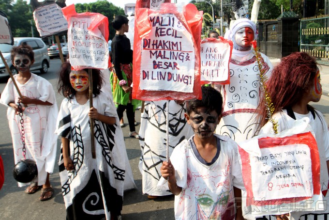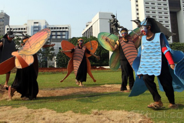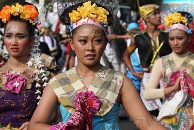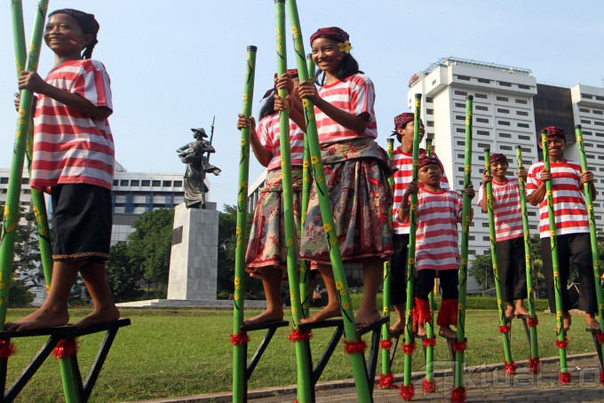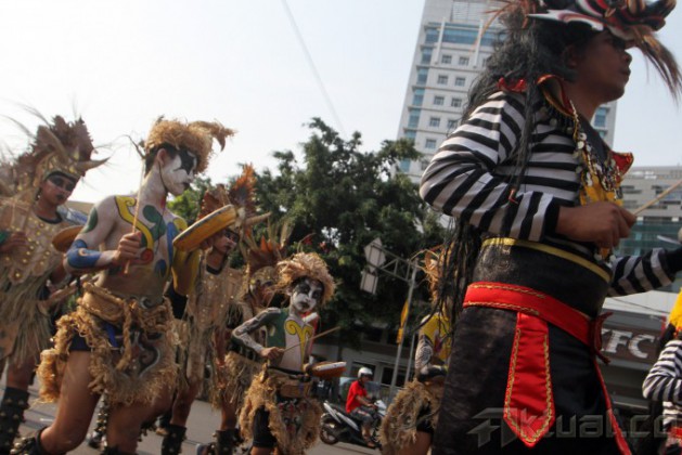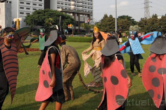 Sejumlah anak mengenakan kostum mengikuti Festival Kampung Budaya Jakarta Kids Art Carnival yang mengangkat tema Legenda Nusantara di kawasan Tugu Tani, Jakarta, Sabtu (23/11/2013). Acara ini merupakan seni pertunjukan karya hasil workshop di kampung-kampung komunitas yang ditampilkan dalam format parade di jalanan, dan bertujuan mewujudkan ruang yang nyaman bagi anak-anak untuk mengekspresikan kemampuan kreatif. Aktual/Tino Oktaviano
