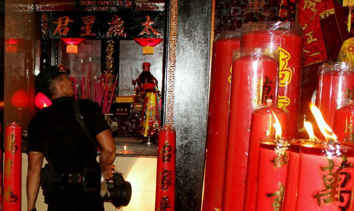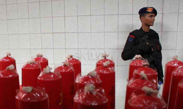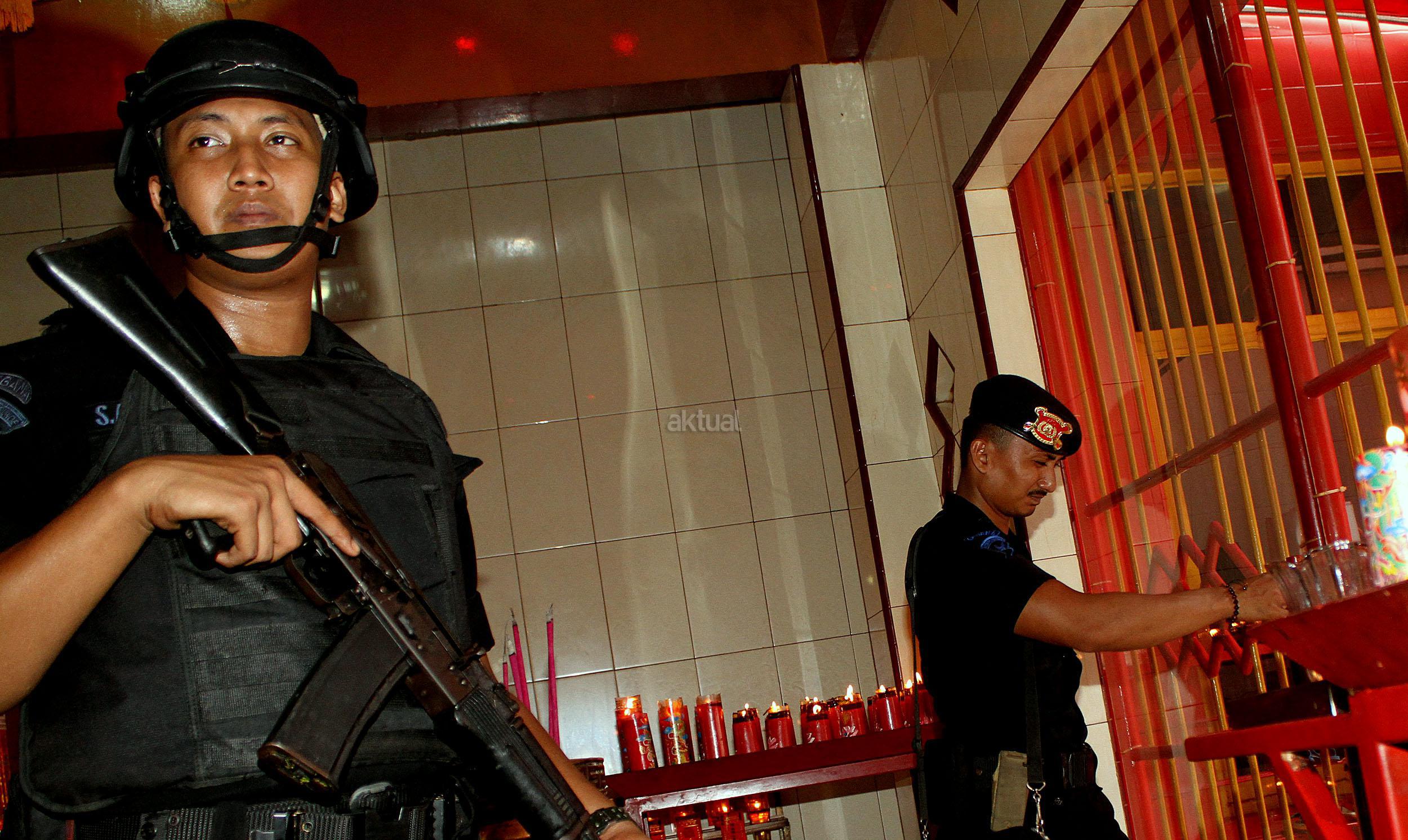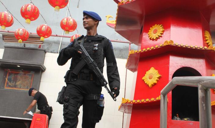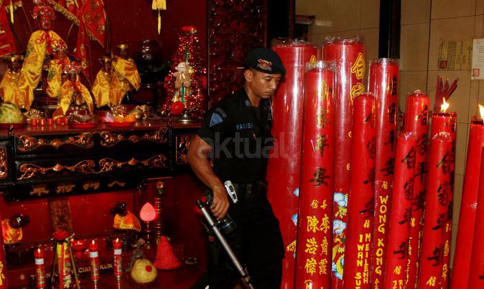 Para petugas dari Gegana Polda Metro Jaya melakukan penyisiran dan pengamanan di Vihara Petak 9, Jakarta Barat, Minggu (7/2/2016). Tim gabungan dari kepolisian, TNI, dan pemerintah daerah menyisir vihara-vihara yang berada di Jakarta Barat. Ini dalam rangka persiapan pengamanan menjelang hari raya Imlek yang jatuh pada Senin, 8 Februari 2016.