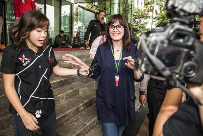 Artis Sandy Harun menyapa awak media saat berjalan keluar gedung KPK, Jakarta, Kamis (11/2). Kedatangan kakak kandung artis Donna Harun tersebut untuk menjenguk istri Gubernur Sumatera Utara nonaktif Gatot Pujo Nugroho, Evi Susanti. ANTARA FOTO/M Agung Rajasa/ama/16