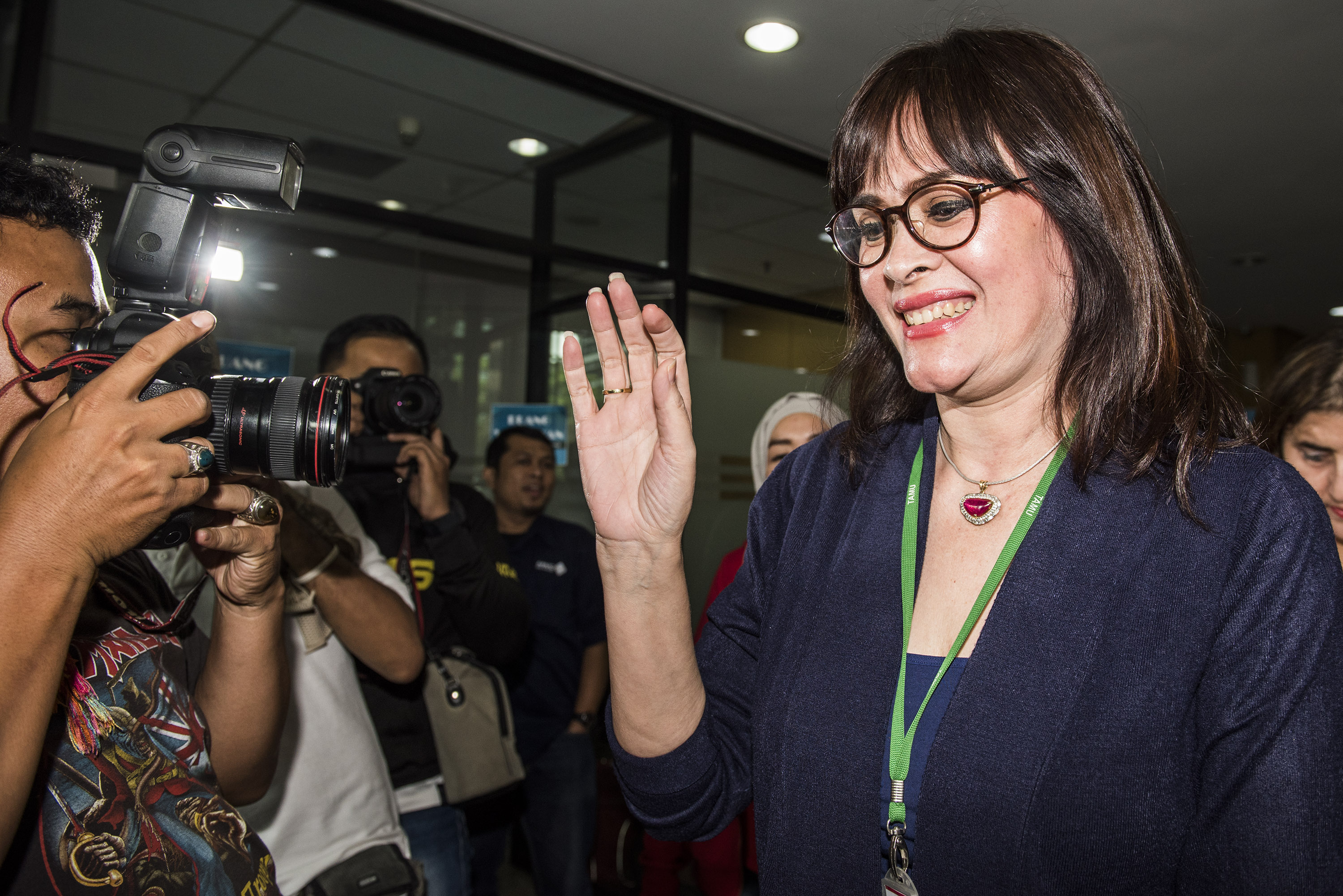 Artis Sandy Harun melambaikan tangann kepada awak media saat tiba di gedung KPK, Jakarta, Kamis (11/2). Kedatangan kakak kandung dari artis Donna Harun tersebut untuk menjenguk istri Gubernur Sumatera Utara nonaktif Gatot Pujo Nugroho, Evi Susanti. ANTARA FOTO/M Agung Rajasa/ama/16