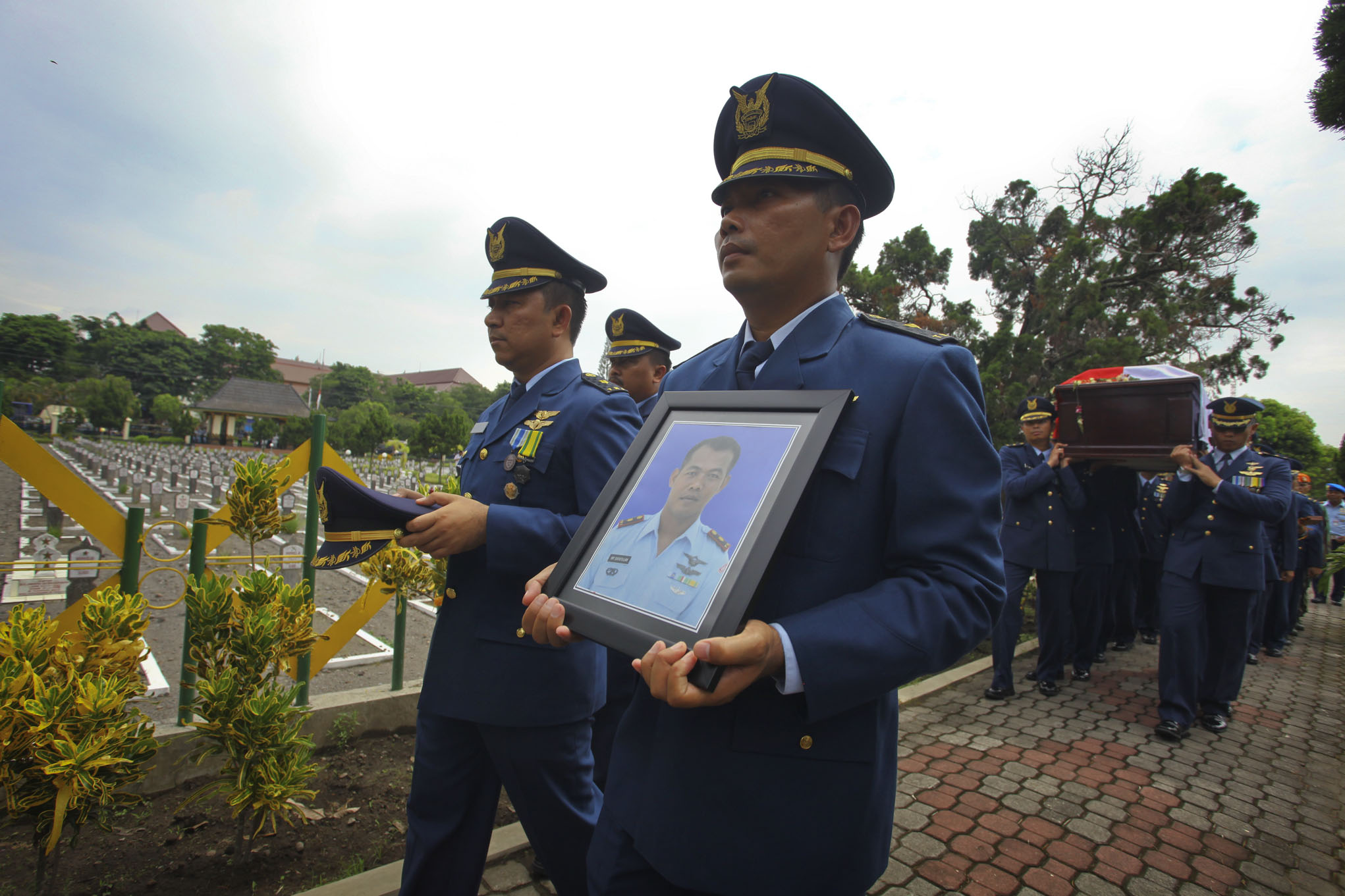 Sejumlah anggota TNI berada di dekat peti jenazah pilot korban jatuhnya pesawat latih militer Super Tucano, Mayor Penerbang Ivy Safatilah saat prosesi pemakaman secara militer di Taman Makam Pahlawan Kusumanegara, DI Yogyakarta, Kamis (11/2). Sebanyak 4 orang tewas yang terdiri dari 2 awak pesawat dan 2 warga sipil akibat jatuhnya pesawat latih militer super Tucano di Malang pada Rabu (10/2). ANTARA FOTO/Andreas Fitri Atmoko/nz/16.