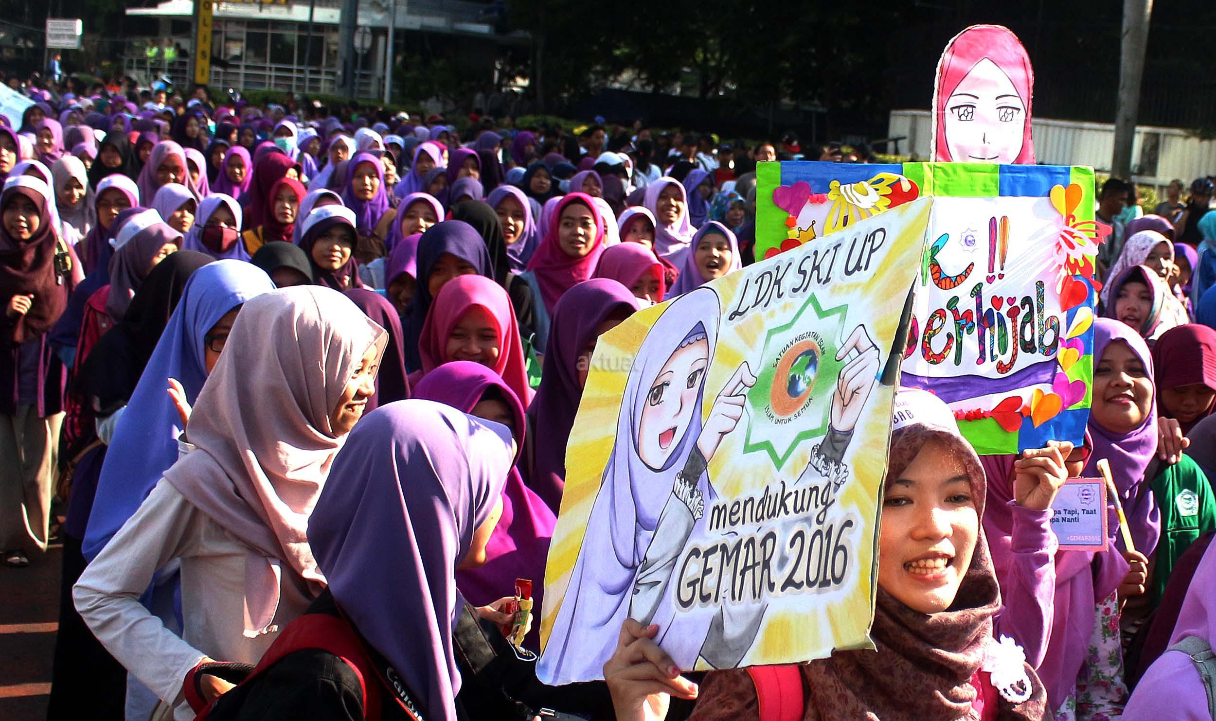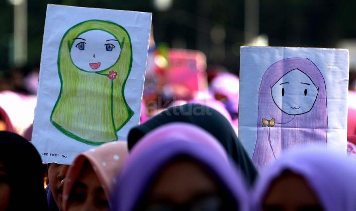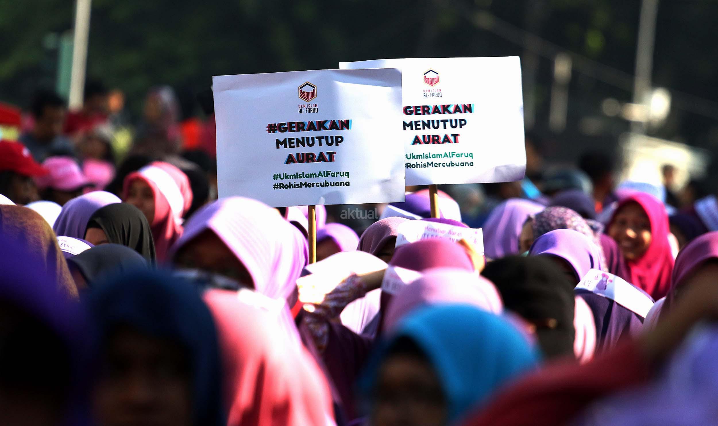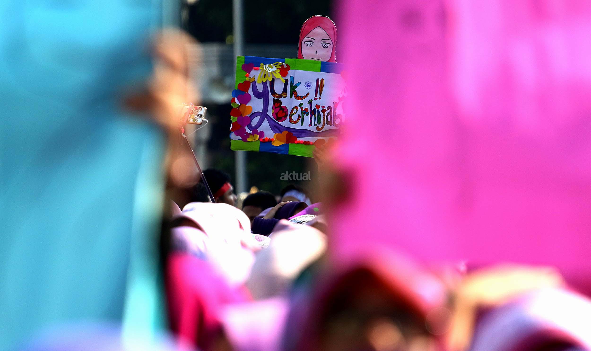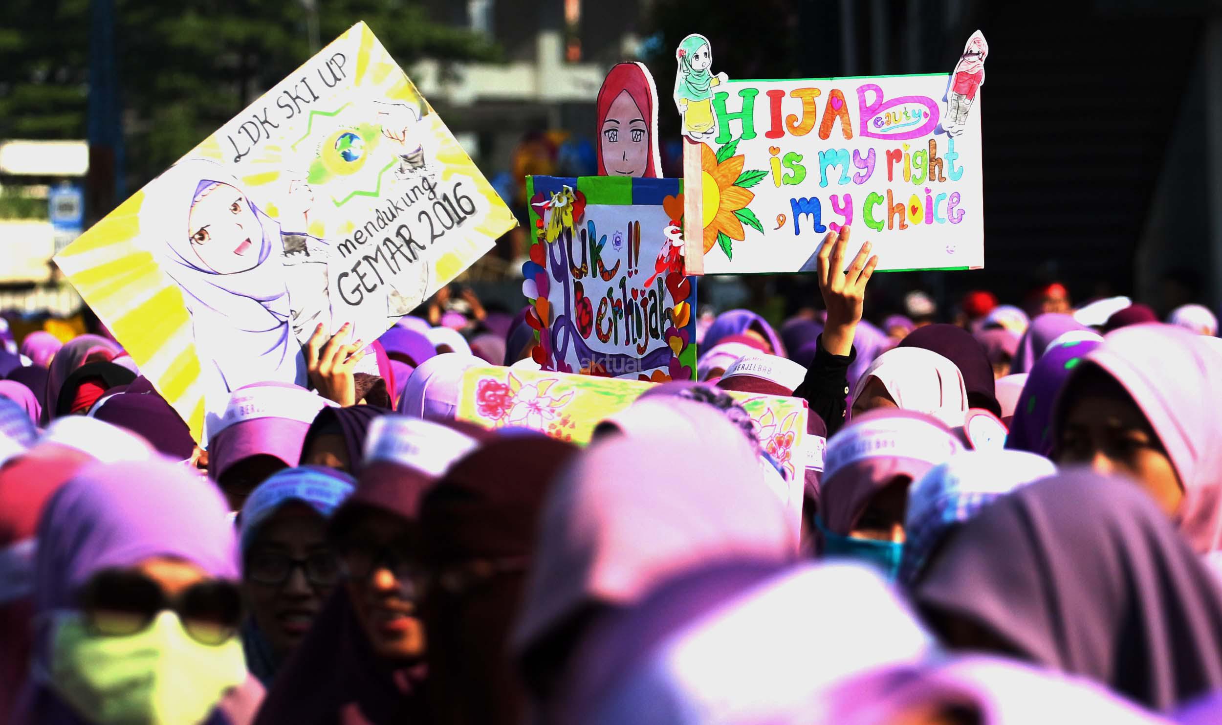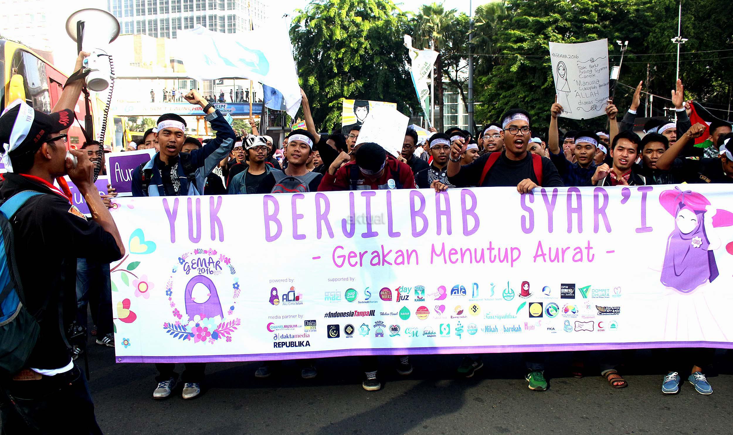 Ratusan mahasiswa yang tergabung dalam Gerakan Menutup Aurat (Gemura) melakukan aksi kampanye di Car Free Day, Bunderan HI, Jakarta, Minggu (14/2/2016). Dalam aksi kampanye Gerakan Menutup Aurat (Gemura) mengajak masyarakat untuk menutup aurat dan mengajak kaum perempuan untuk memakai hijab.