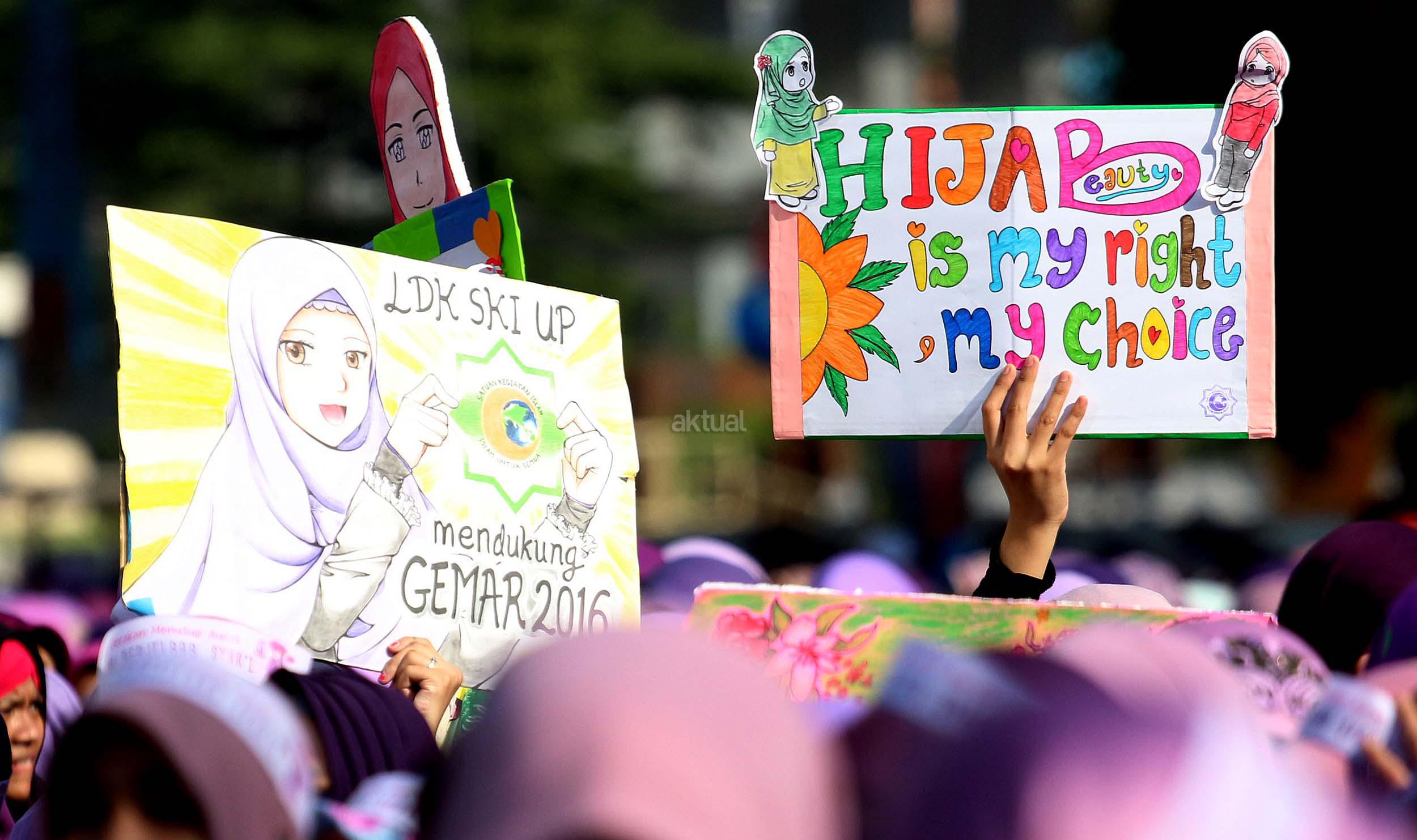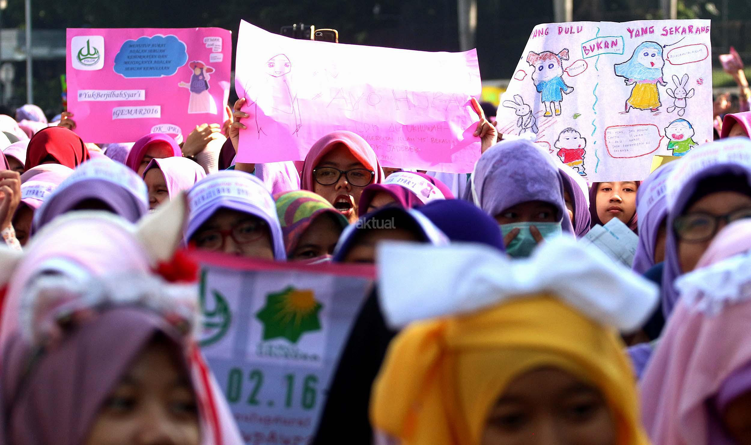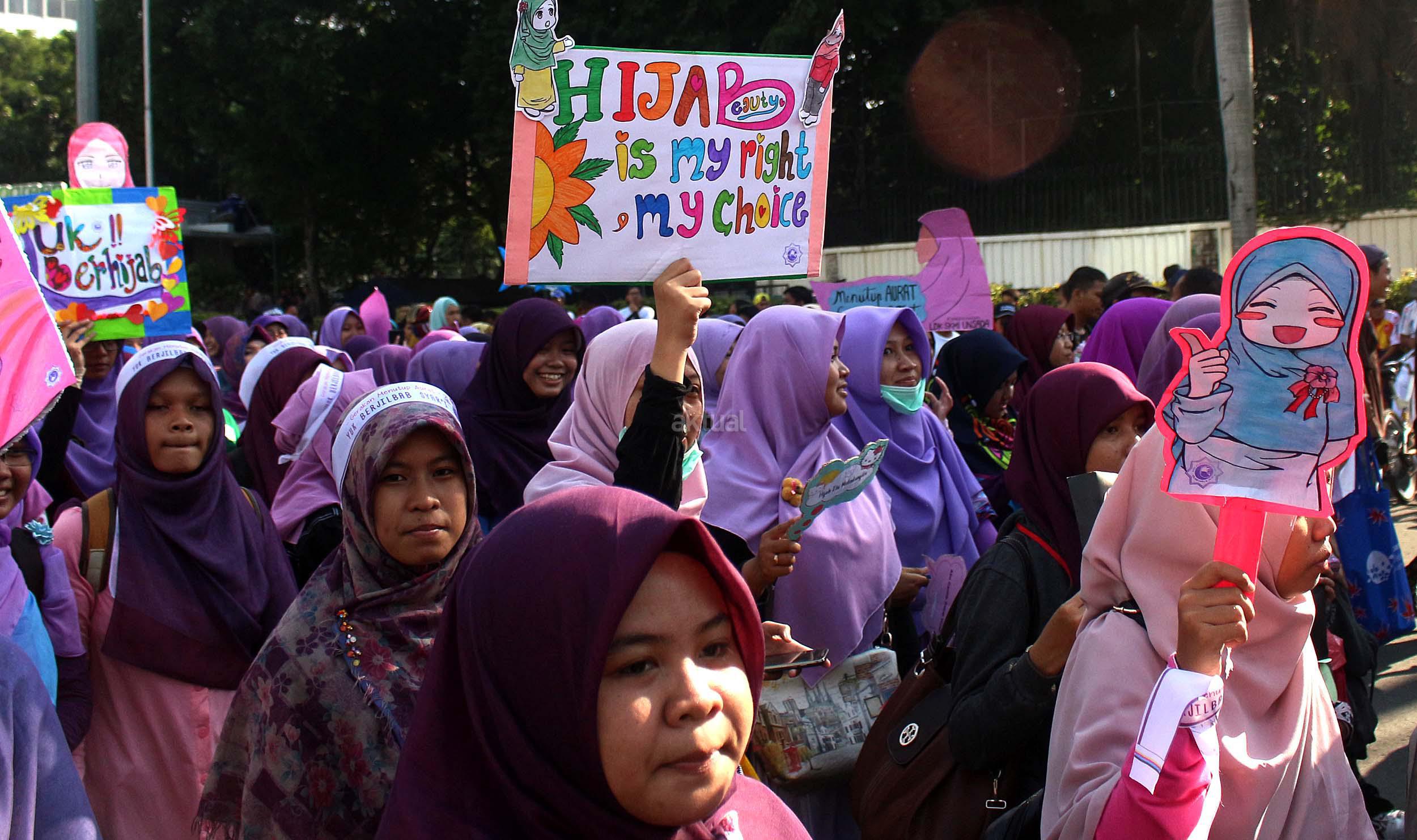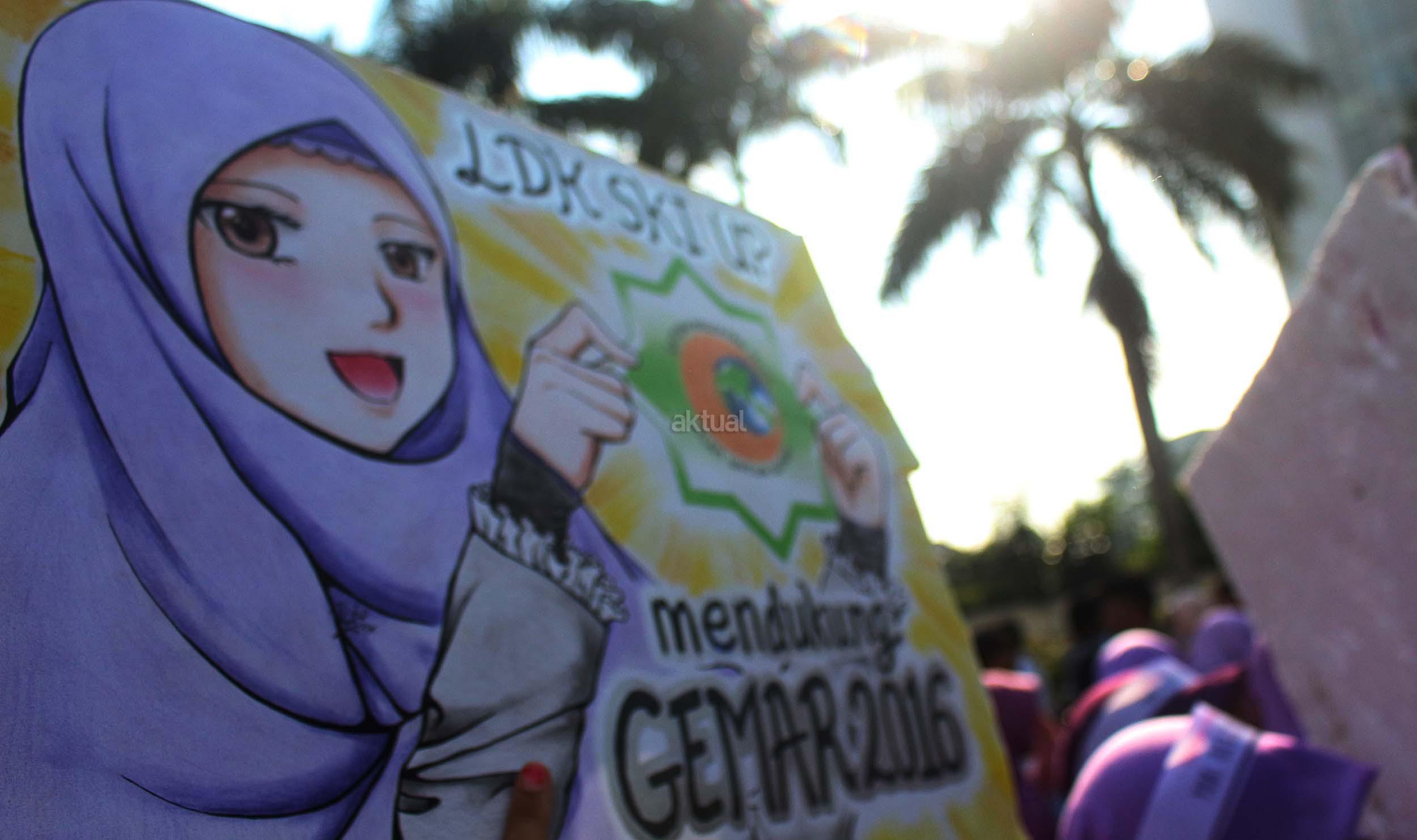 Ratusan mahasiswa yang tergabung dalam Gerakan Menutup Aurat (Gemura) melakukan aksi kampanye di Car Free Day, Bunderan HI, Jakarta, Minggu (14/2/2016). Dalam aksi kampanye Gerakan Menutup Aurat (Gemura) mengajak masyarakat untuk menutup aurat dan mengajak kaum perempuan untuk memakai hijab.