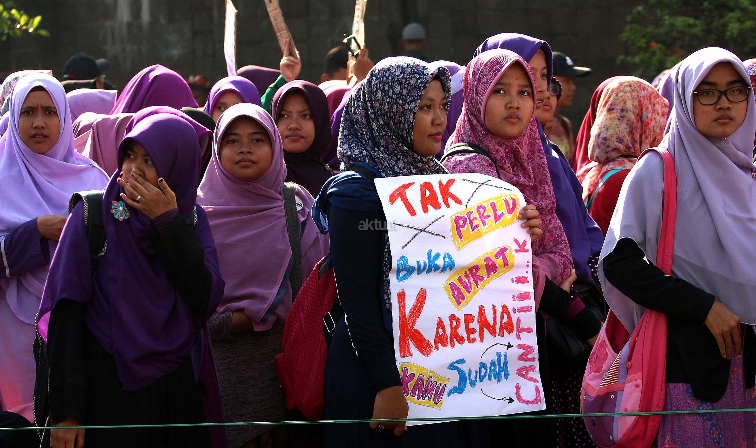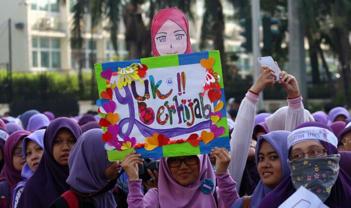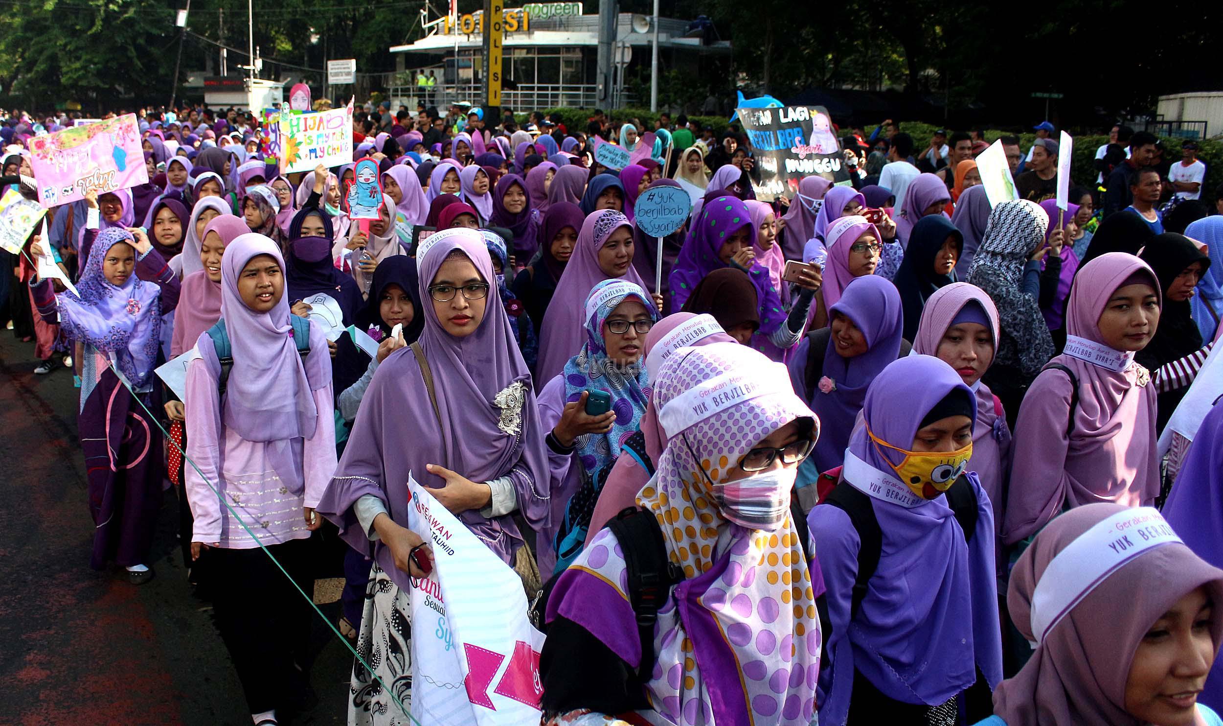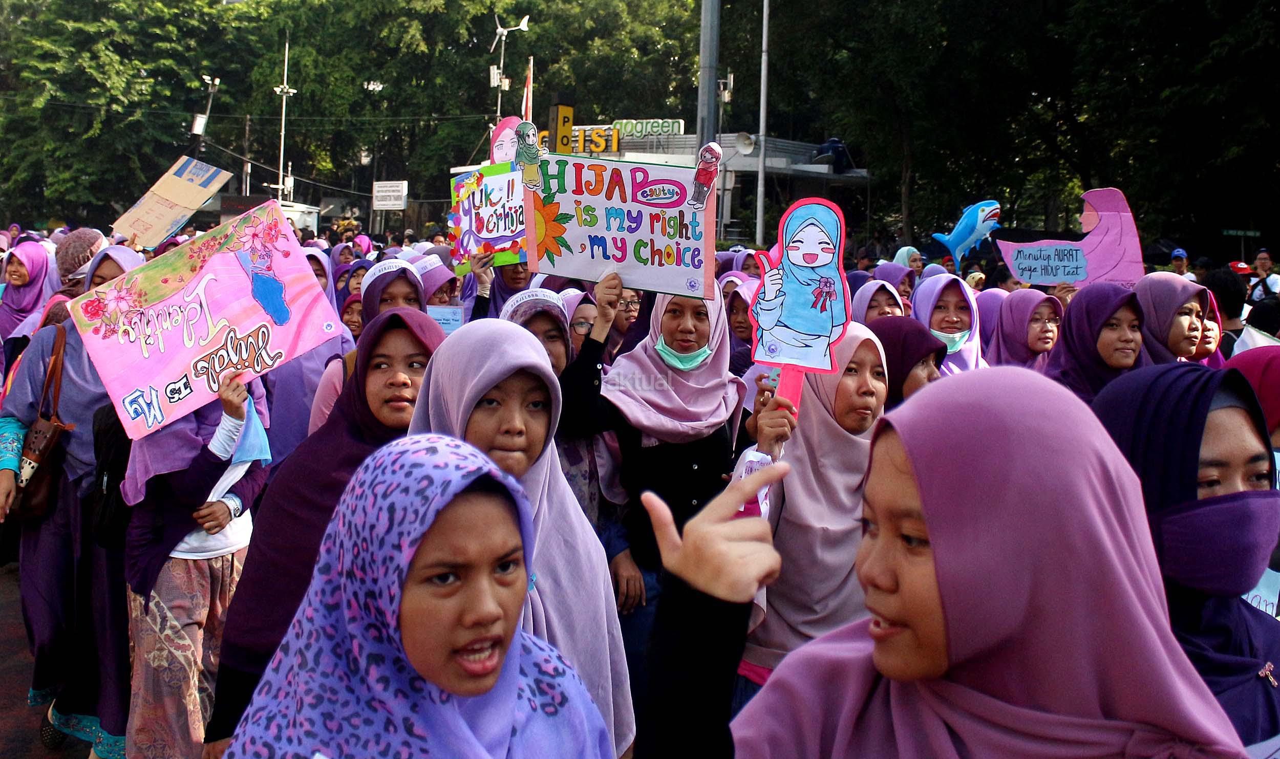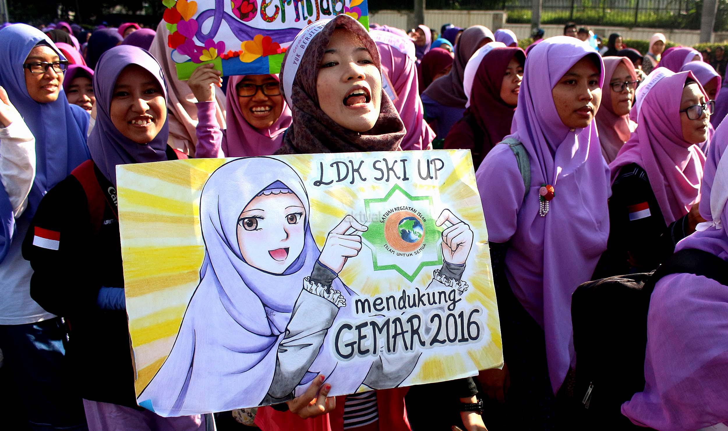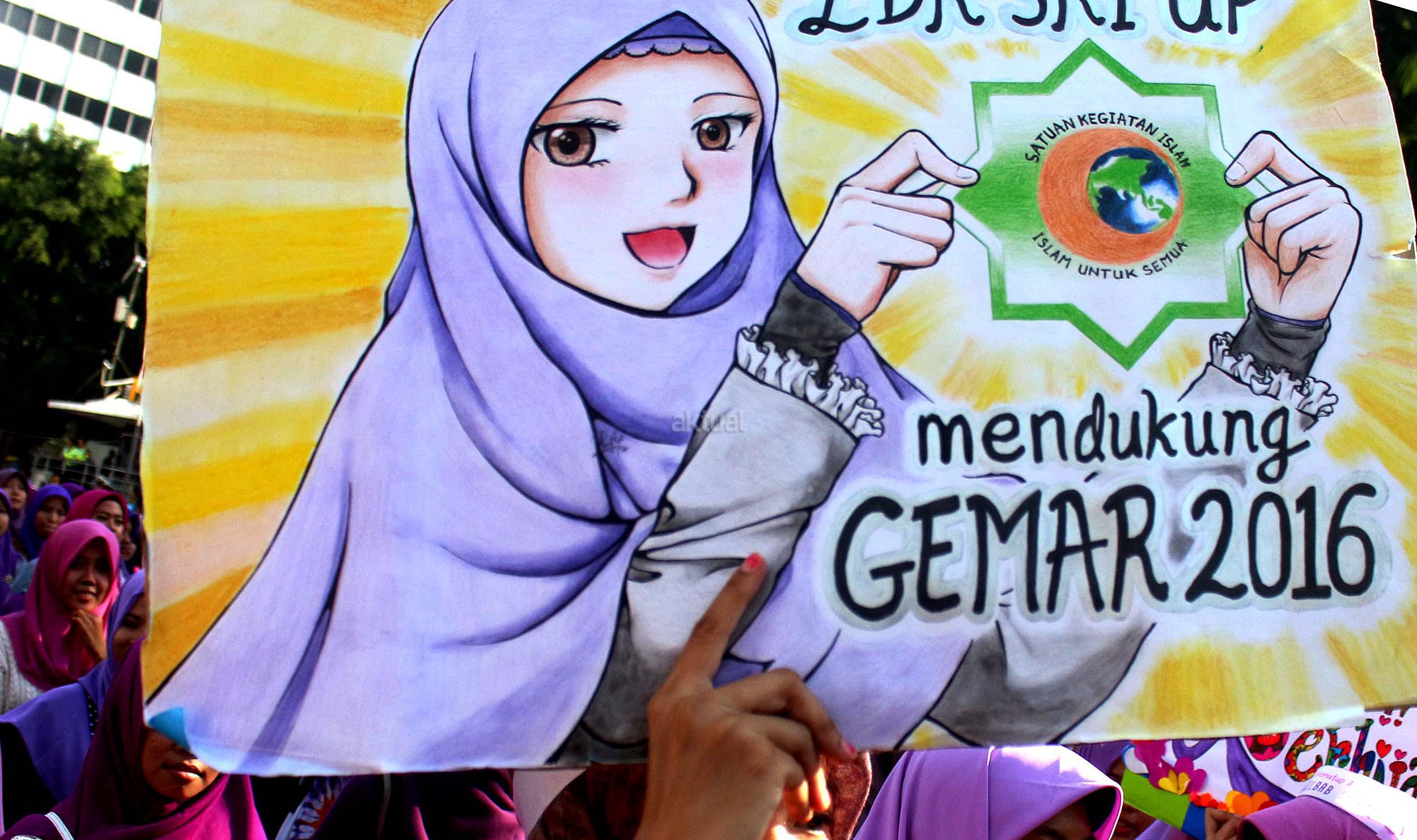 Ratusan mahasiswa yang tergabung dalam Gerakan Menutup Aurat (Gemura) melakukan aksi kampanye di Car Free Day, Bunderan HI, Jakarta, Minggu (14/2/2016). Dalam aksi kampanye Gerakan Menutup Aurat (Gemura) mengajak masyarakat untuk menutup aurat dan mengajak kaum perempuan untuk memakai hijab.