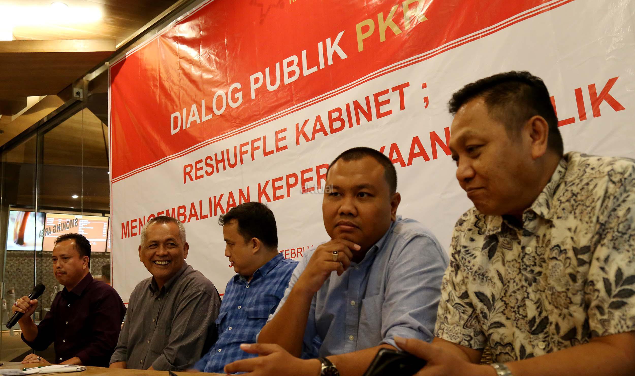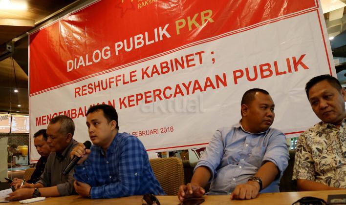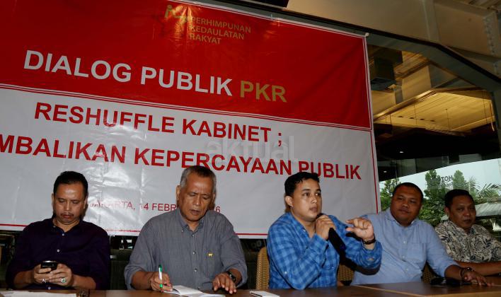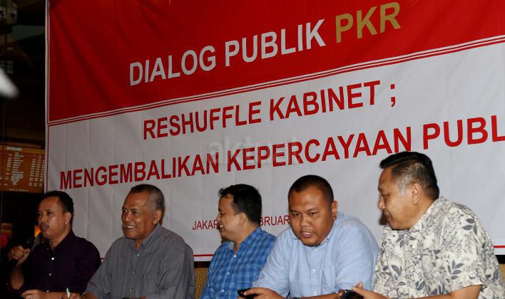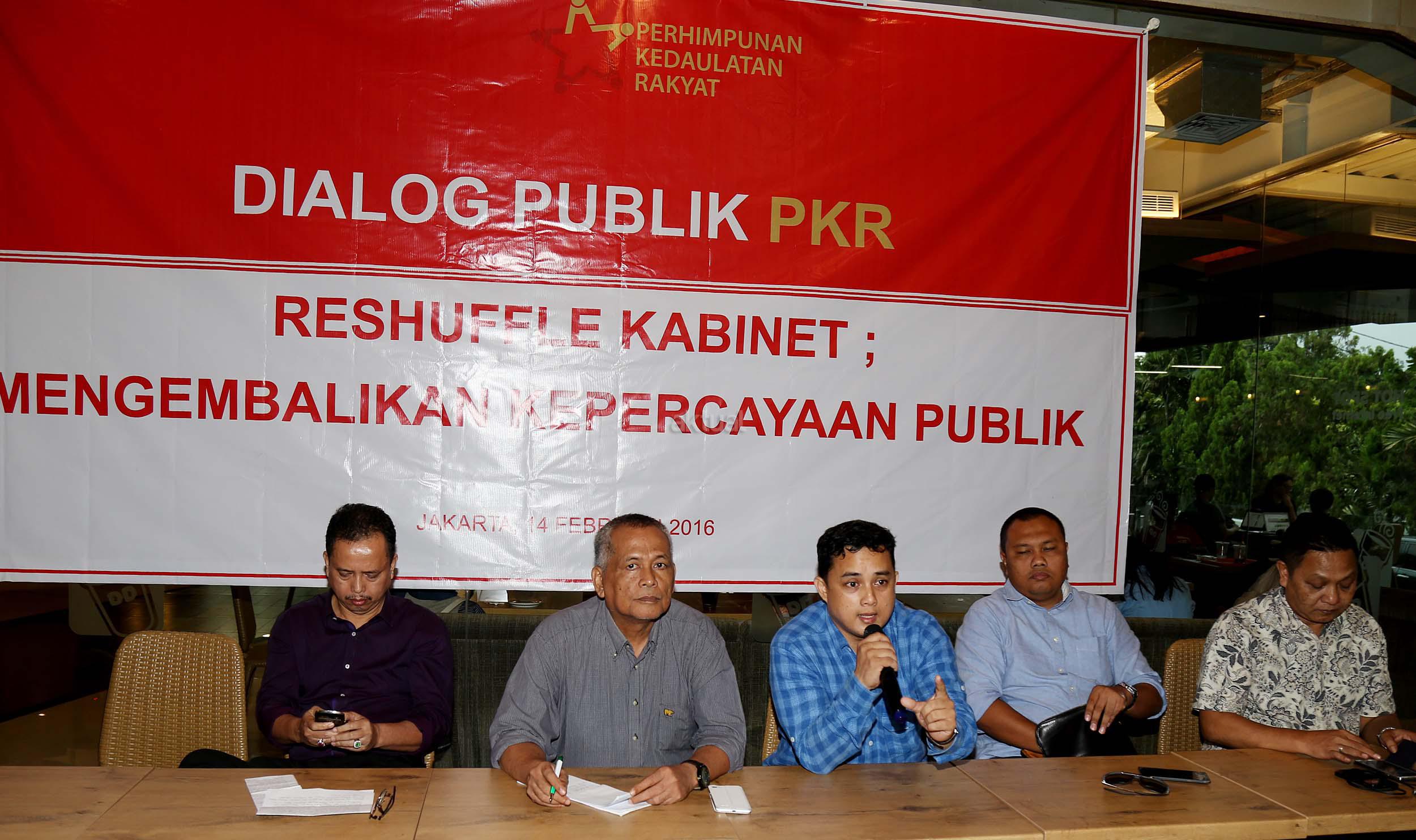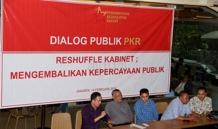 Kiri-kanan; Ketua Presidium Indonesia Police Watch (IPW) Neta S Pane, Direktur Institut Ekonomi Politik Soekarno Hatta (IEPSH) Hatta Taliwang, Sekjen Perhimpunan Kedaulatan Rakyat (PKR) Khalid Zabidi, Pengamat Politik Hendro Satrio, dan Koordinator Gerakan Indonesia Bersih Adhie M Massardi saat dialog publik di Menteng, Jakarta, Minggu (14/2/2016). Dialog yang diselenggarakan oleh Perhimpunan Kedaulatan Rakyat (PKR),mengangkat tema "Resuffle Kabinet : Mengembalikan Kepercayaan Publik".