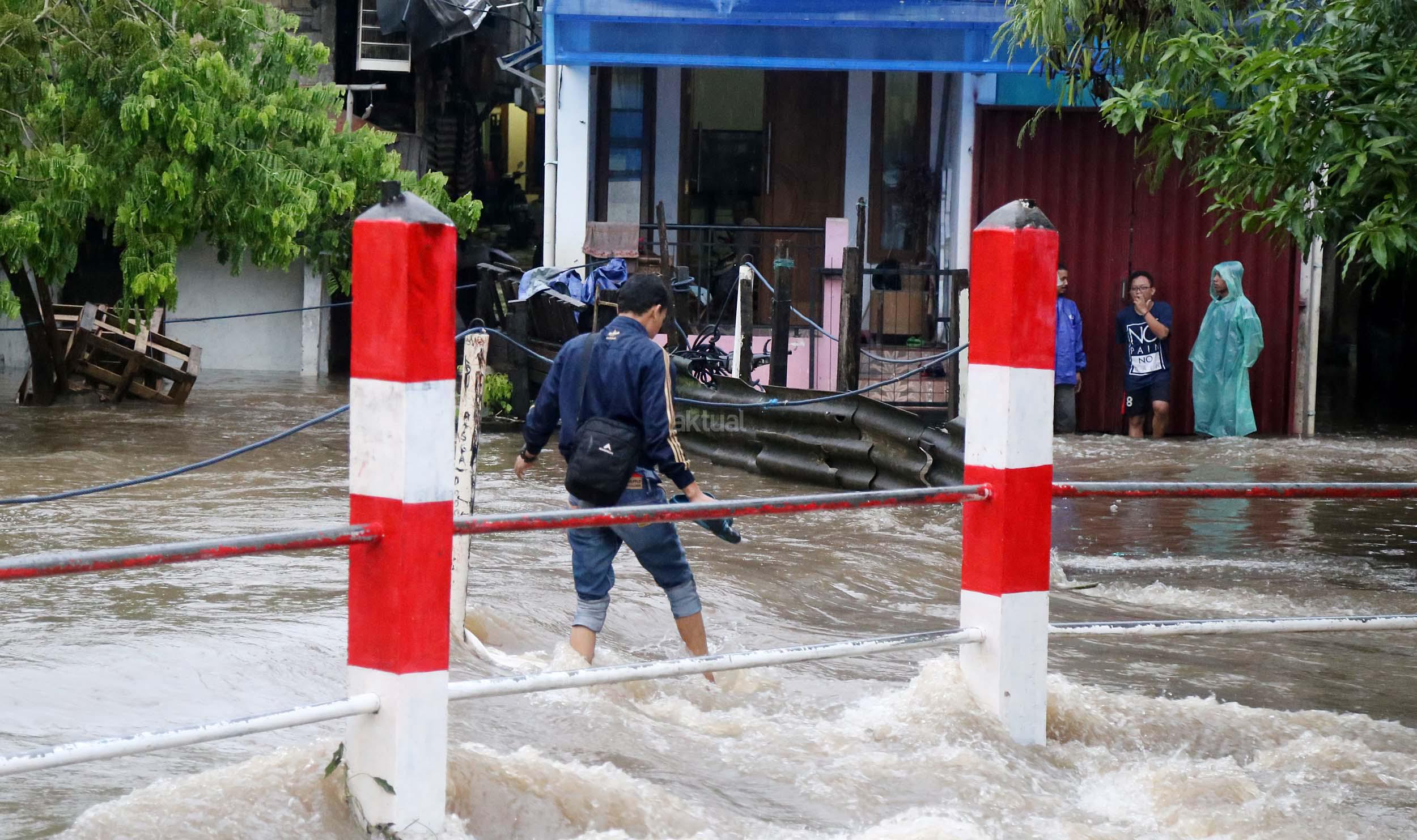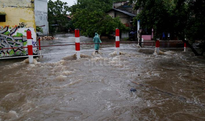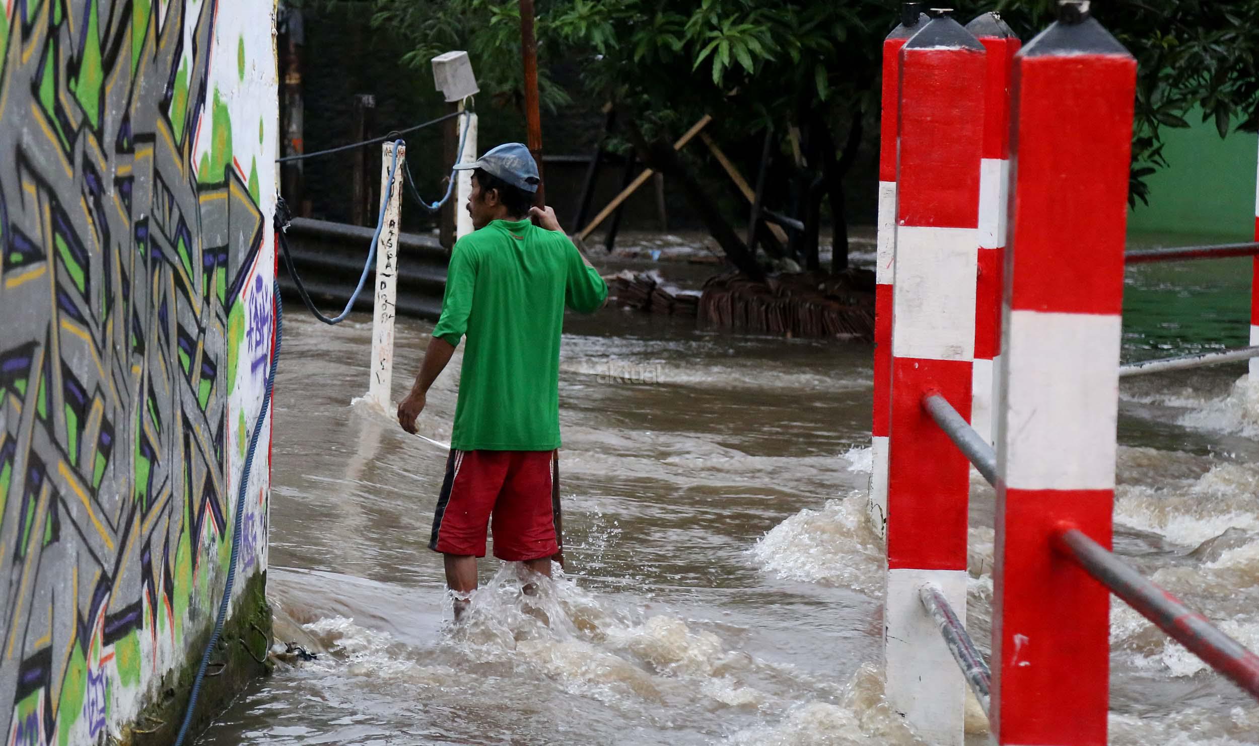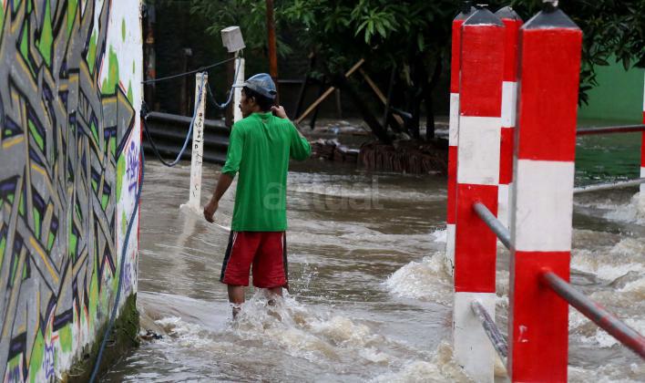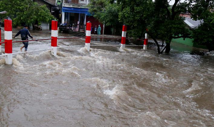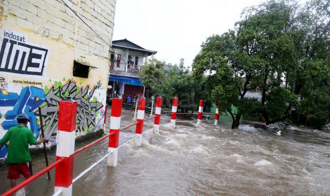 Warga Mampang Prapatan saat melintasi jembatan Kali Mampang yang mengalami banjir hingga menutup ruas jembatan yang menghubungkan pemukiman warga Mampang Prapatan, Jakarta Selatan, Minggu (14/2/2016). Hujan deras yang mengguyur wilayah Ibukota, Minggu (14/2) siang membuat sejumlah ruas jalan tergenang. Di Jakarta Selatan, genangan terparah diantaranya melanda Jl Kemang Raya dan Jl Kemang IX, Kelurahan Bangka, Mampang Prapatan dengan ketinggian air mencapai 60 sentimeter (cm) hingga 1 meter.