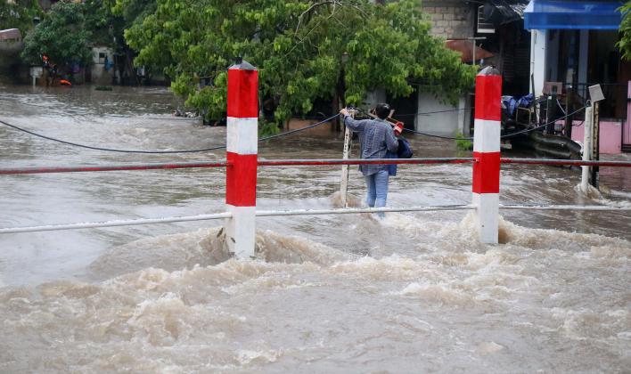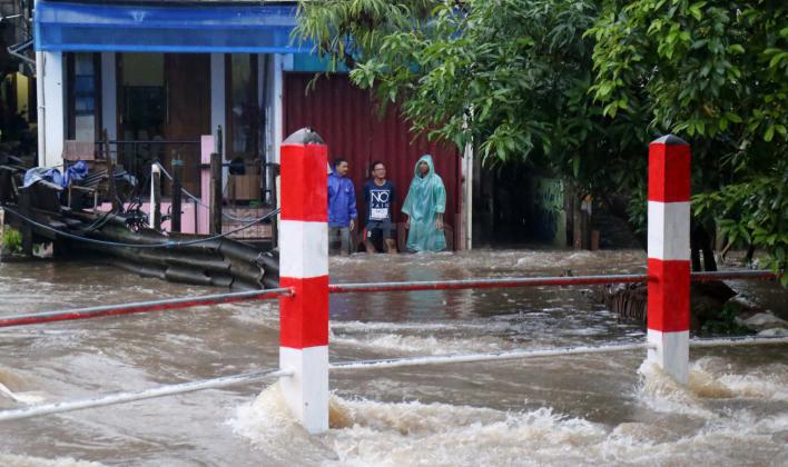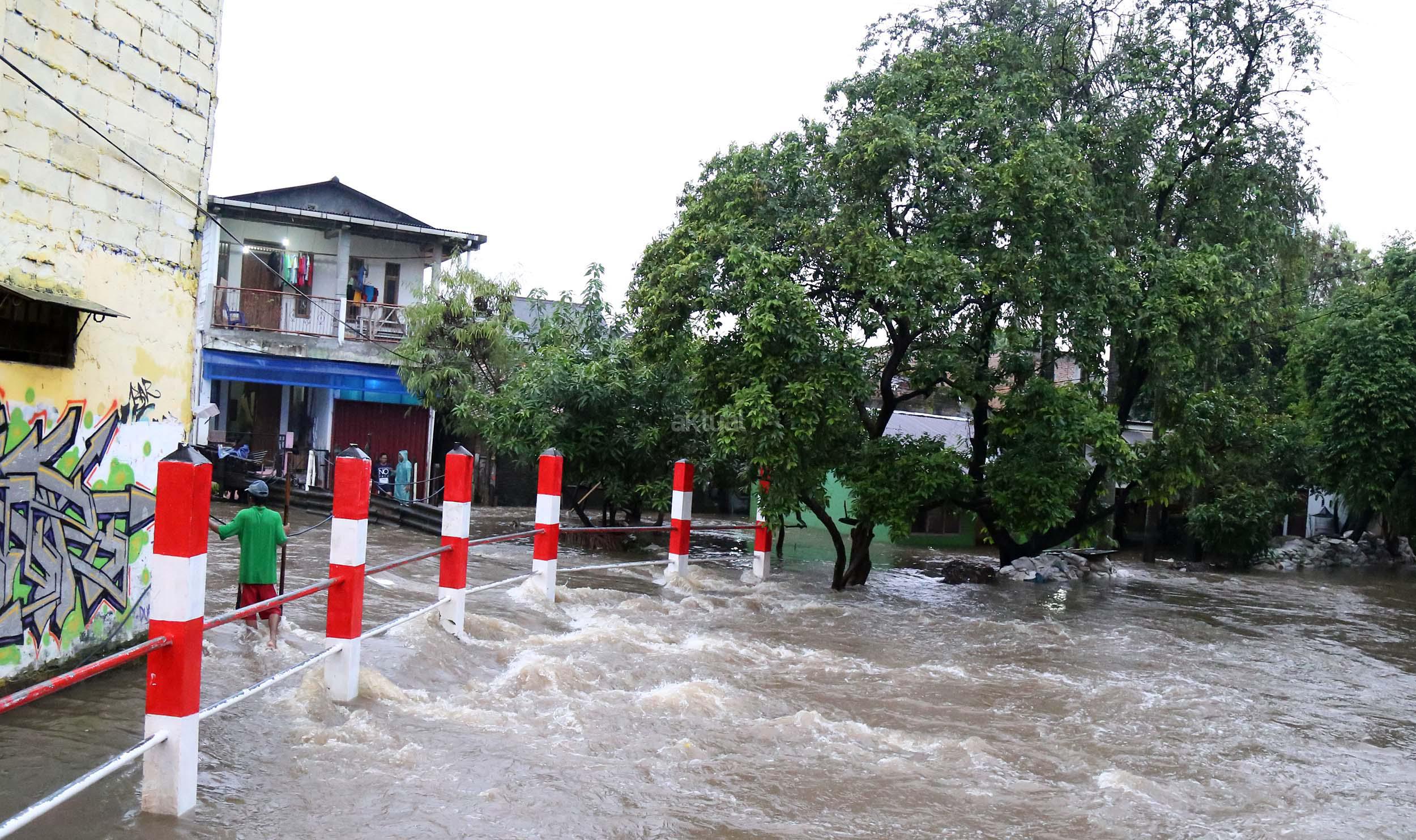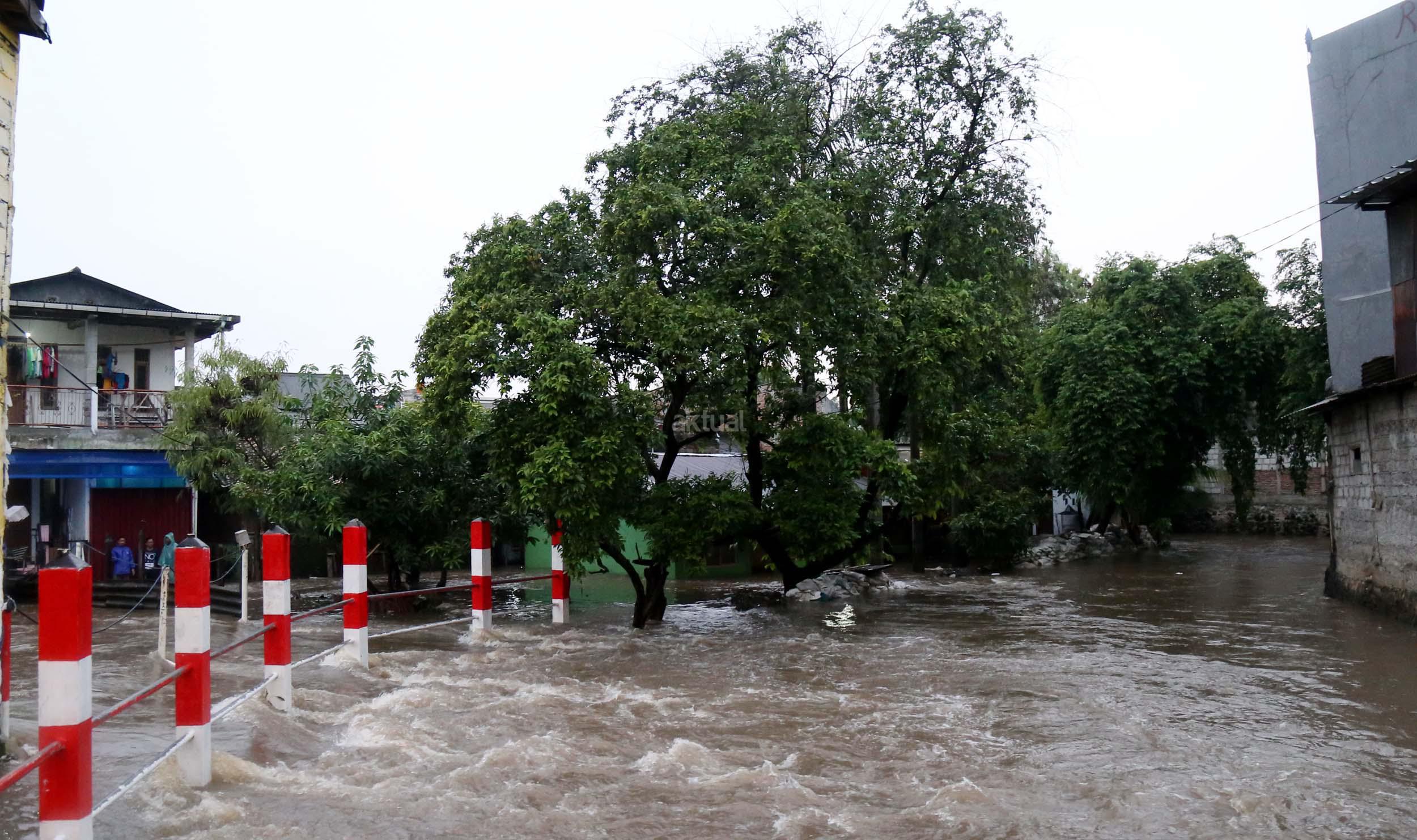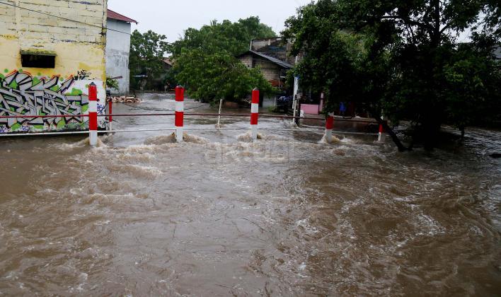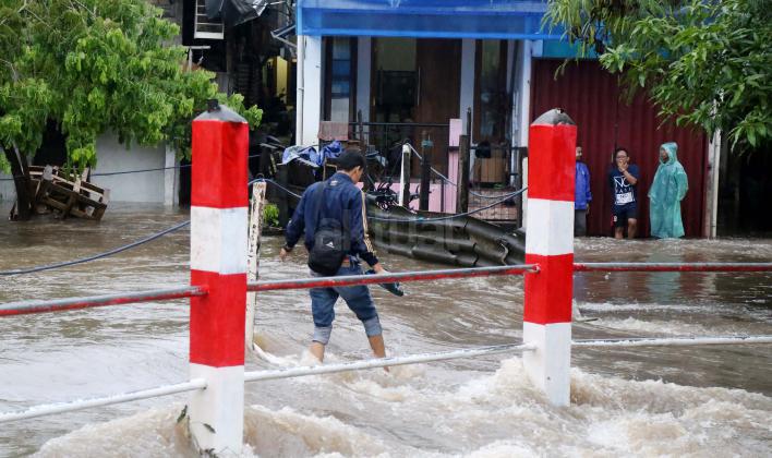 Warga Mampang Prapatan saat melintasi jembatan Kali Mampang yang mengalami banjir hingga menutup ruas jembatan yang menghubungkan pemukiman warga Mampang Prapatan, Jakarta Selatan, Minggu (14/2/2016). Hujan deras yang mengguyur wilayah Ibukota, Minggu (14/2) siang membuat sejumlah ruas jalan tergenang. Di Jakarta Selatan, genangan terparah diantaranya melanda Jl Kemang Raya dan Jl Kemang IX, Kelurahan Bangka, Mampang Prapatan dengan ketinggian air mencapai 60 sentimeter (cm) hingga 1 meter.