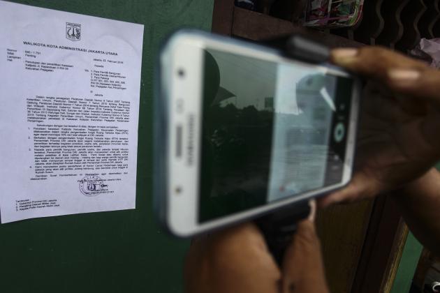 Warga memotret menggunakan telepon seluler surat pemberitahuan dari Pemprov DKI Jakarta yang tertempel di salah satu rumah di kawasan Kalijodo, Jakarta, Minggu (14/2). Surat edaran tersebut berisi antara lain akan adanya pengembalian fungsi kawasan Kalijodo menjadi Ruang Terbuka Hijau (RTH), dan tawaran bagi warga untuk beralih profesi atau dipulangkan ke daerah masing-masing. ANTARA FOTO/Muhammad Adimaja/kye/16