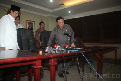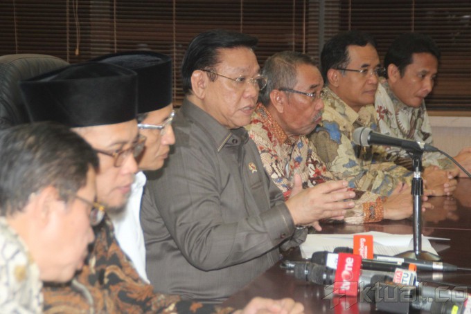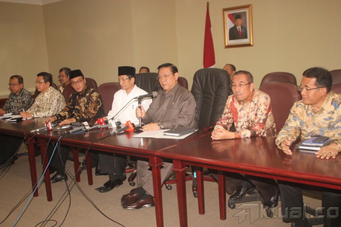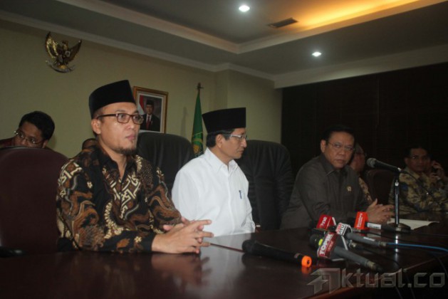 Pelaksana Tugas Menteri Agama Agung Laksono (kanan) bersama Wakil Menteri Agama Nasaruddin Umar (kiri) bersiap melakukan jumpa pers di Kementrian Agama terkait mundurnya Dirjen Penyelenggara Haji & Umrah (PHU) Anggito Abimanyu, Jumat (30/5/2014). Anggito digantikan Abdul Jamil yang sebelumnya menjabat Dirjen Bimbingan Masyarakat Islam Kemenag. Aktual/Tino Oktaviano