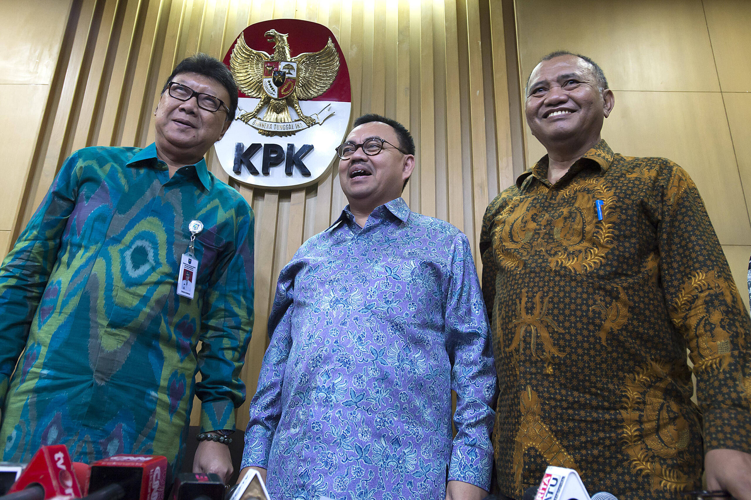 Ketua KPK Agus Rahardjo (kanan), Menteri ESDM Sudirman Said (tengah) dan Mendagri Tjahjo Kumolo (kiri) berbincang usai memberikan keterangan pers hasil rapat koordinasi di Gedung KPK, Jakarta, Senin (15/2). Rapat koordinasi tersebut membahas soal tindak lanjut dan pengawasan atas pengelolaan pertambangan mineral dan batubara serta sektor energi tahun 2016. ANTARA FOTO/Widodo S. Jusuf/aww/16.