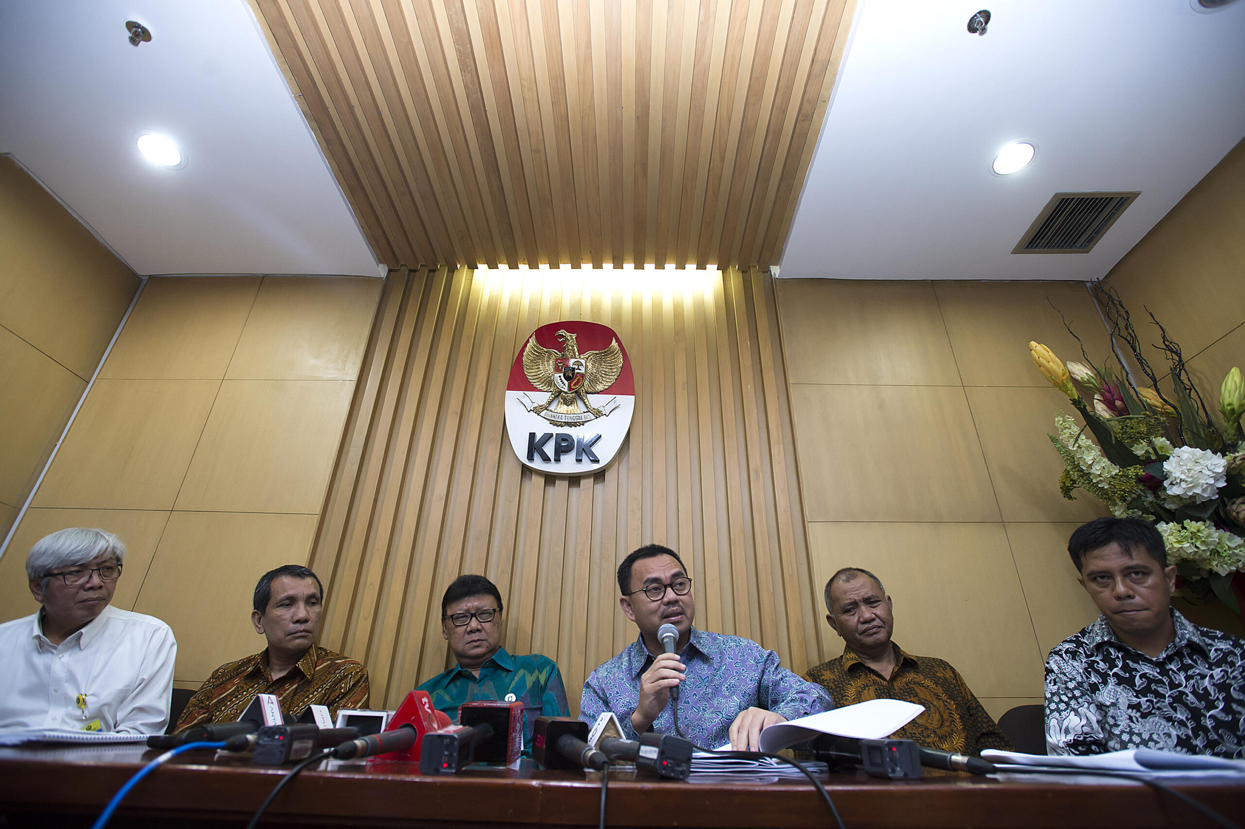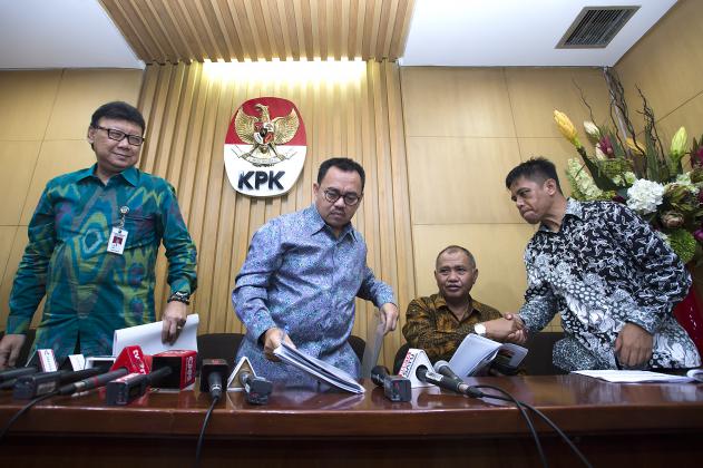 Ketua KPK Agus Rahardjo (kedua kanan), Menteri ESDM Sudirman Said (kedua kiri), Mendagri Tjahjo Kumolo (kiri) dan Koordinator Koalisi Anti Mafia Tambang Pius Ginting (kanan) bergegas usai memberikan keterangan pers hasil rapat koordinasi di Gedung KPK, Jakarta, Senin (15/2). Rapat koordinasi tersebut membahas soal tindak lanjut dan pengawasan atas pengelolaan pertambangan mineral dan batubara serta sektor energi tahun 2016. ANTARA FOTO/Widodo S. Jusuf/aww/16.