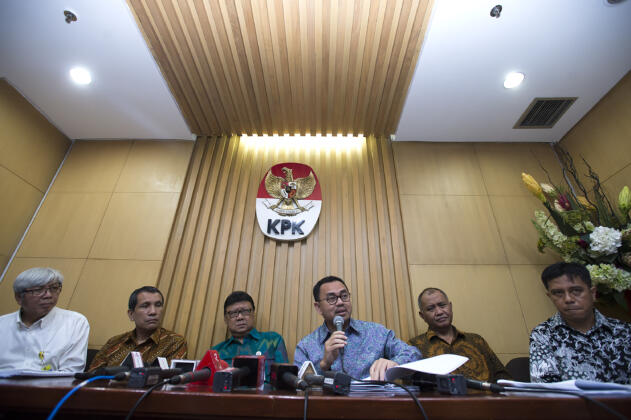 Menteri ESDM Sudirman Said (ketiga kanan), Mendagri Tjahjo Kumolo (ketiga kiri), Ketua KPK Agus Rahardjo (kedua kanan), Koordinator Koalisi Anti Mafia Tambang Pius Ginting (kanan), Deputi Pencegahan KPK Pahala Nainggolan (kedua kiri) dan Dirjen Minerba KESDM Bambang Gatot Ariyono (kiri) memberikan keterangan pers hasil rapat koordinasi di Gedung KPK, Jakarta, Senin (15/2). Rapat koordinasi tersebut membahas soal tindak lanjut dan pengawasan atas pengelolaan pertambangan mineral dan batubara serta sektor energi tahun 2016. ANTARA FOTO/Widodo S. Jusuf/aww/16.