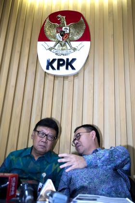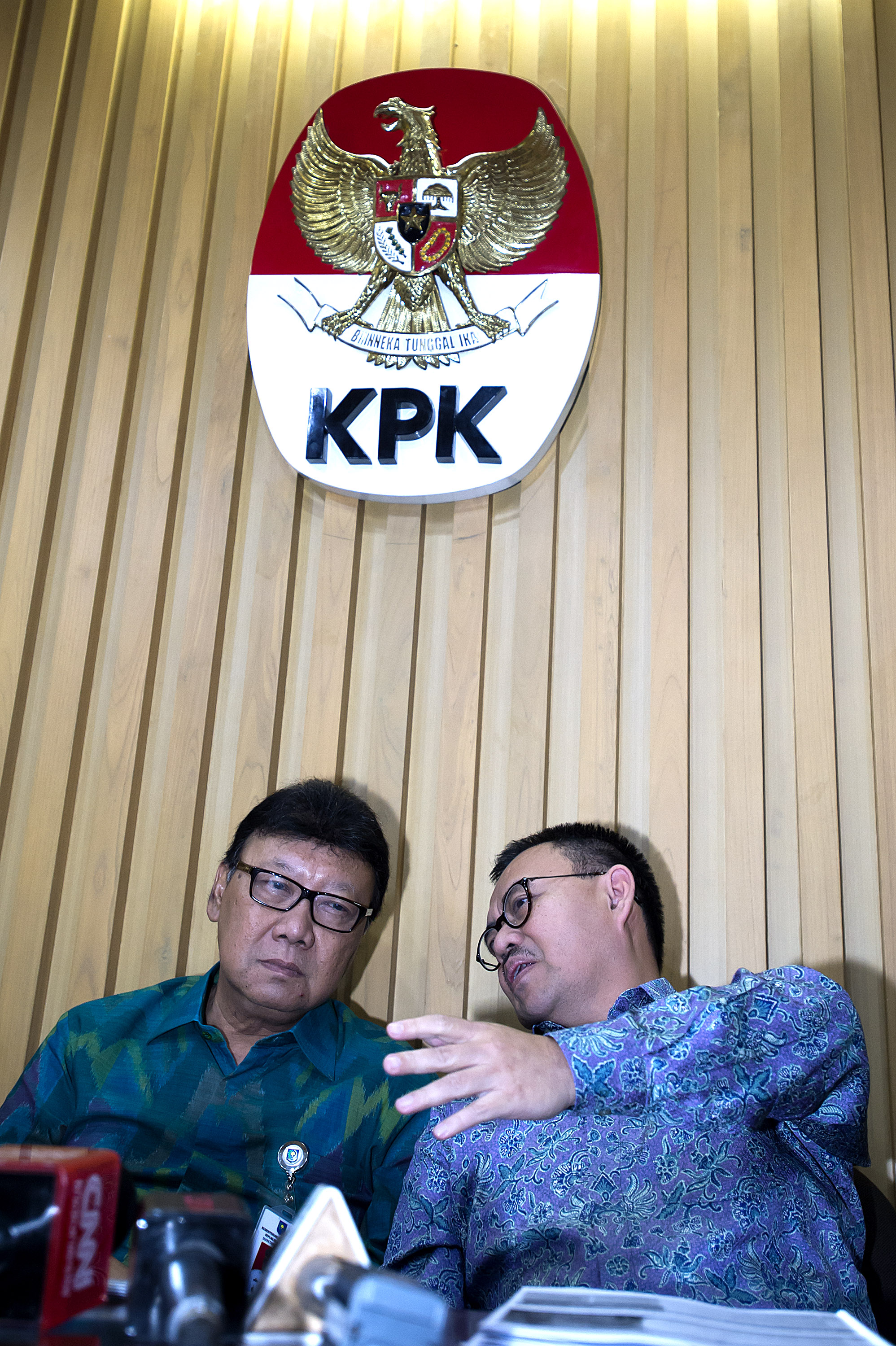 Menteri ESDM Sudirman Said (kanan) berbincang dengan Mendagri Tjahjo Kumolo (kiri) usai memberikan keterangan pers hasil rapat koordinasi di Gedung KPK, Jakarta, Senin (15/2). Rapat koordinasi tersebut membahas soal tindak lanjut dan pengawasan atas pengelolaan pertambangan mineral dan batubara serta sektor energi tahun 2016. ANTARA FOTO/Widodo S. Jusuf/aww/16.