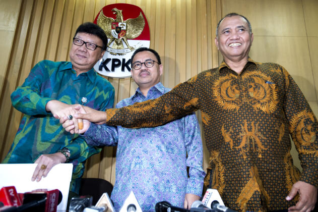 Ketua KPK Agus Rahardjo (kanan), Menteri ESDM Sudirman Said (tengah) dan Mendagri Tjahjo Kumolo (kiri) berjabat tangan usai memberikan keterangan pers hasil rapat koordinasi di Gedung KPK, Jakarta, Senin (15/2). Rapat koordinasi tersebut membahas soal tindak lanjut dan pengawasan atas pengelolaan pertambangan mineral dan batubara serta sektor energi tahun 2016. ANTARA FOTO/Widodo S. Jusuf/aww/16.