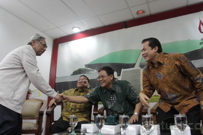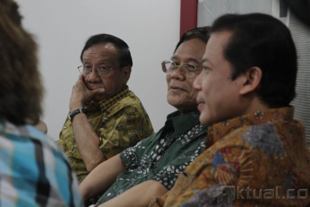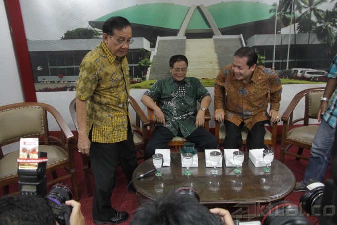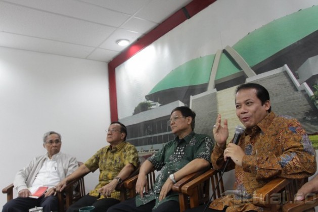 Politisi senior PDIP Sabam Sirait (kiri), Ketua Dewan Pembina Partai Golkar Akbar Tanjung (kedua kiri), Anggota Dewan Pertimbangan Partai Demokrat Ahmad Mubarok (kedua kanan) dan Wakil Ketua DPR Taufik Kurniawan (kanan) menjadi pembicara diskusi Dialektika di Kompleks Parlemen, Senayan, Jakarta, Kamis (31/10/2013). Diskusi tersebut menyoroti regenerasi kepemimpinan nasional terutama jelang Pemilu dan Pilpres 2014. Aktual/Tino Oktaviano