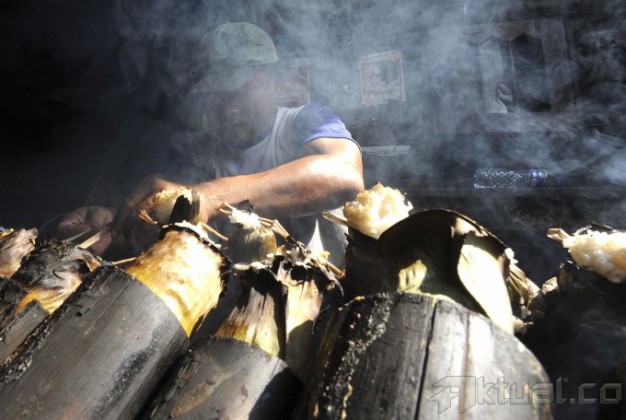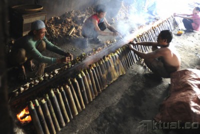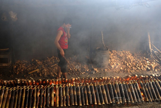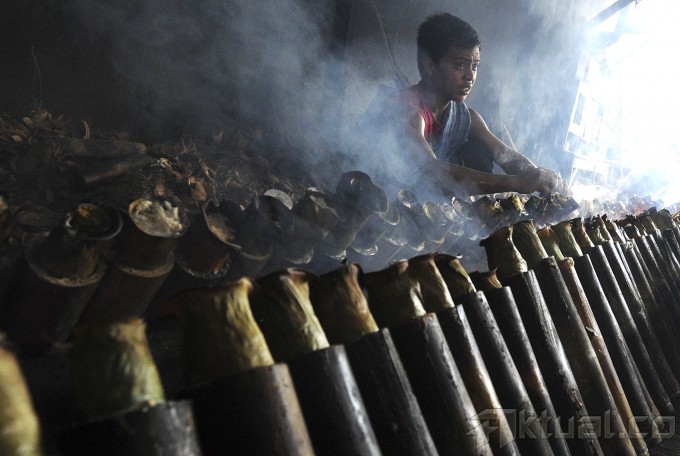 Pekerja membakar ketan lemang makanan tradisional Sumatera Barat di kawasan Kramat Raya, Jakarta, Kamis (3/7/2014). Bulan Ramadan pembuat lemang mengaku kebanjiran order hingga 600 buah dari pada di hari biasa hanya 150 buah/hari. Aktual/Tino Oktaviano