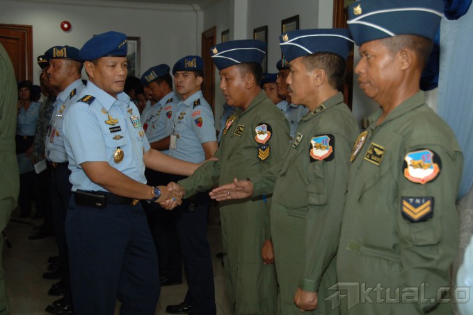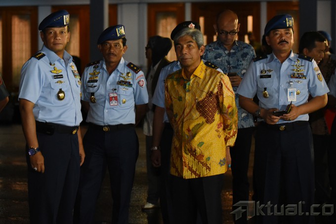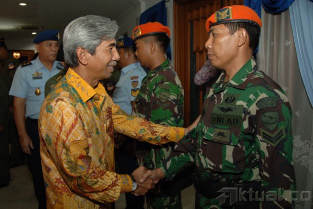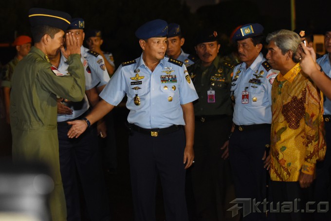 Wakil Menlu AM Fachir (kanan) didampingi Kepala Staf Angkatan Udara (KSAU) Marsekal TNI Agus Supriatna (tengah) menerima penghormatan dari personel TNI AU yang akan berangkat ke Yaman di Lapangan Udara (Lanud) Halim Perdanakusuma, Jakarta, Kamis (2/4). Sebanyak 22 personel TNI AU dan perwakilan Kemlu berangkat ke Yaman untuk mengevakuasi WNI. ANTARA FOTO/Hafidz Mubarak A