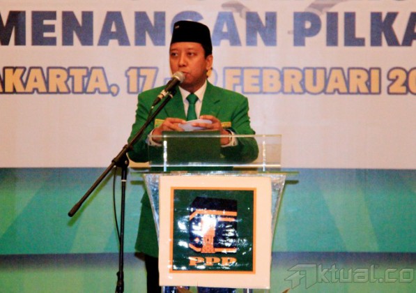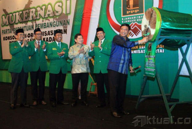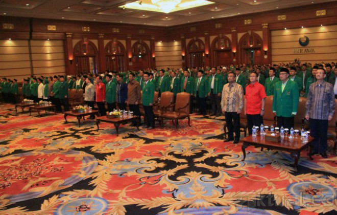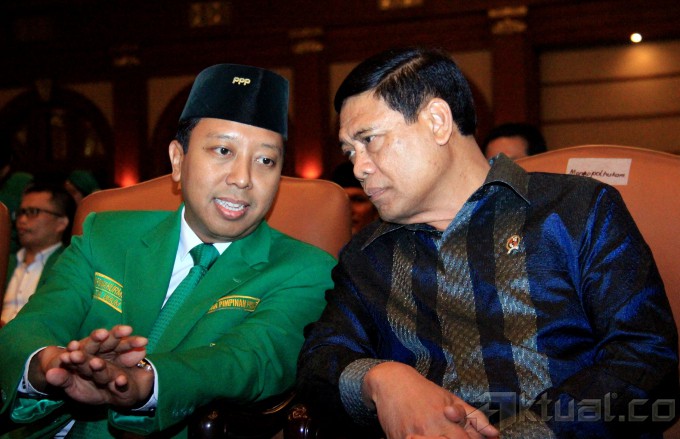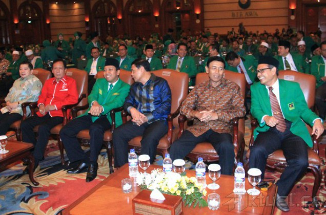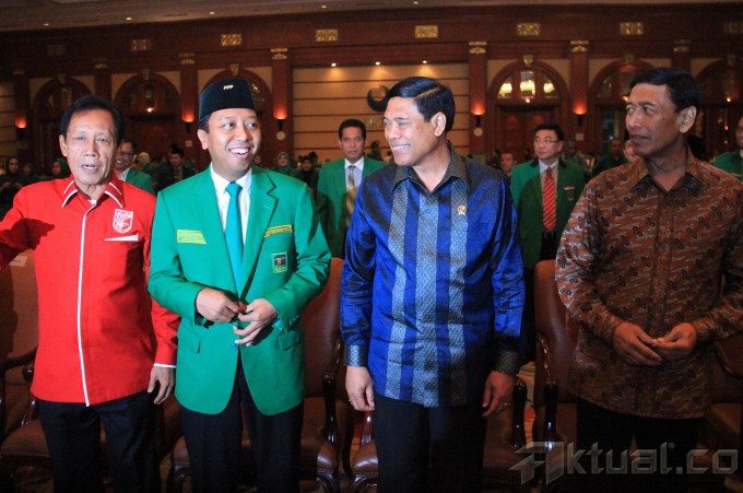 Ketua Umum Partai Persatuan Pembangunan (PPP) versi Surabaya M Romahurmuziy berbincang dengan Menkopolhukam Tedjo Edhi Purdijatno, Anggota Watimpres Suharso Monoarfa, Ketua Umum Hanura Wiranto, Ketua Umum PKPI Sutiyoso, Sekjen saat Musyawarah Kerja Nasional (Mukernas) I PPP vesri Surabaya di Hotel Bidakara, Jakarta Selatan, Selasa (17/2/2015). Mukernas PPP versi Surabaya ini dihadiri DPW/DPC yang dilaksanakan dari 17 hingga 19 Februari 2015. AKTUAL/MUNZIR